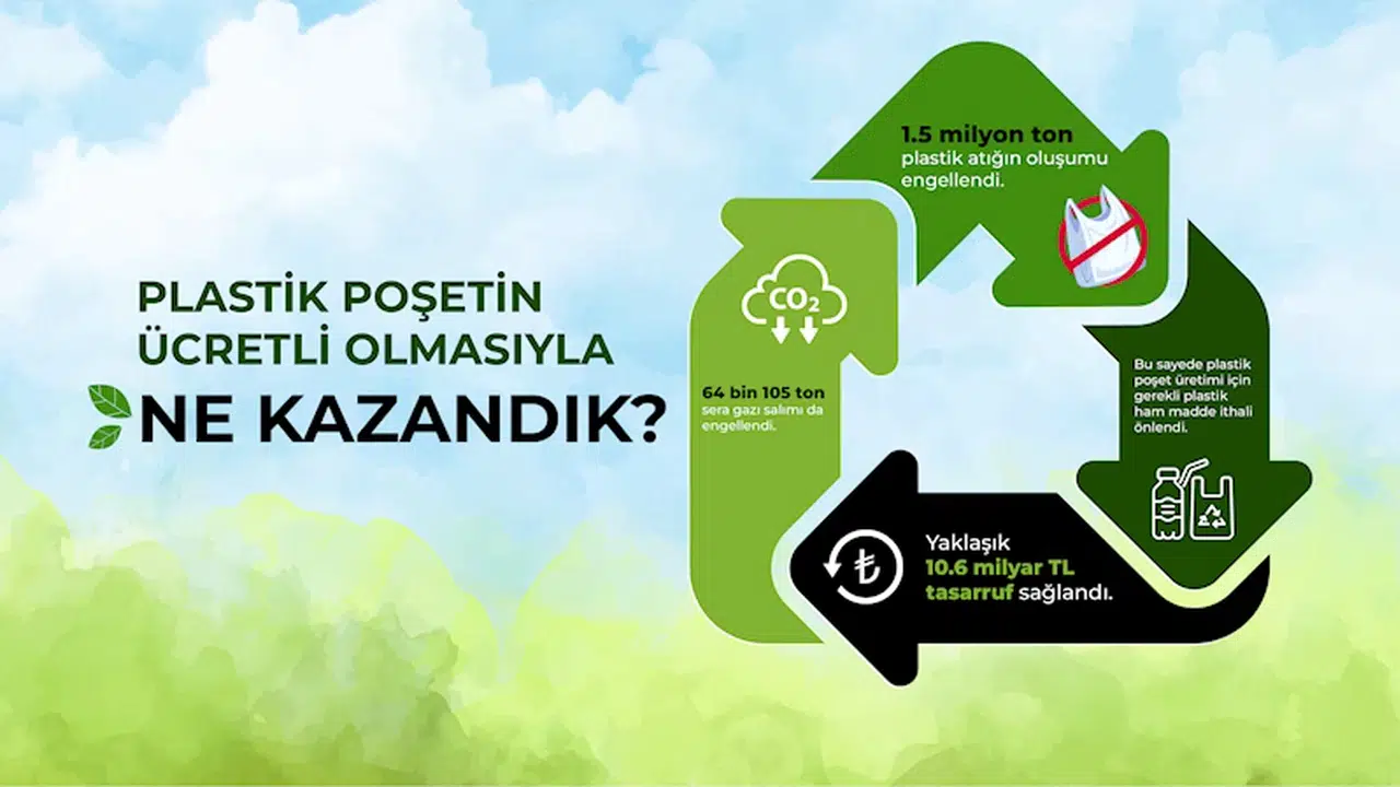 Plastik poşetlerin ücretlendirilmesi uygulaması ile 2019-2024 yıllarında plastik poşet kaynaklı 1,5 milyon ton plastik atığın oluşumunun engellendiği, bu sayede plastik poşet üretimi için gerekli plastik hammadde ithalinin önlendiği ve yaklaşık 10,6 milyar TL tasarruf sağlandığı aktarıldı. Ayrıca yaklaşık 64 bin 105 ton sera gazı salımının da engellendiği belirtildi. (DHA)