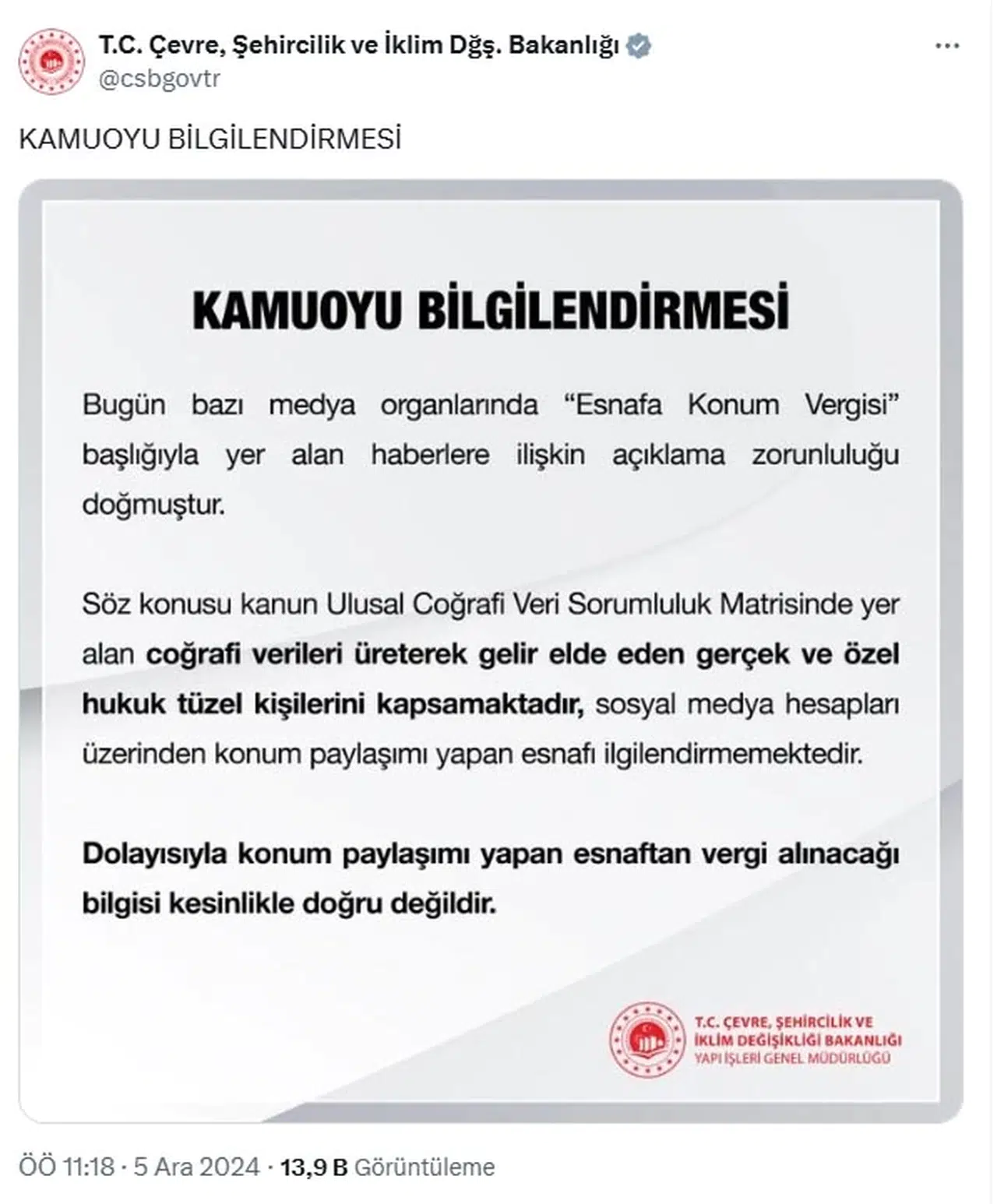 ANKARA, (DHA)- ÇEVRE, Şehircilik ve İklim Değişikliği Bakanlığı, 'Esnafa konum vergisi geliyor' iddiasının doğru olmadığını duyurdu.
