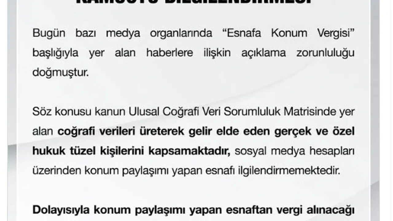 Bakanlıktan yapılan açıklamada, bugün bazı medya organlarında 'Esnafa konum vergisi' başlığıyla yer alan haberlere ilişkin açıklama yapma zorunluluğu doğduğu belirtilerek, "Söz konusu kanun Ulusal Coğrafi Veri Sorumluluk Matrisinde yer alan coğrafi verileri üreterek gelir elde eden gerçek ve özel hukuk tüzel kişilerini kapsamaktadır, sosyal medya hesapları üzerinden konum paylaşımı yapan esnafı ilgilendirmemektedir. Dolayısıyla konum paylaşımı yapan esnaftan vergi alınacağı bilgisi kesinlikle doğru değildir" denildi.