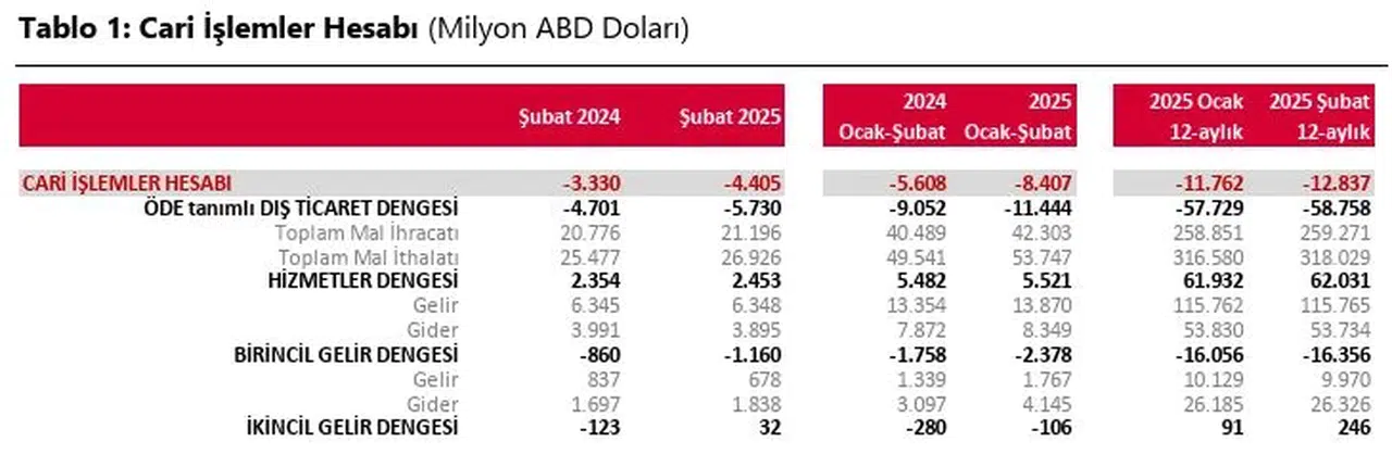 Caner ÜNVER/ANKARA, (DHA)- TÜRKİYE Cumhuriyet Merkez Bankası (TCMB), şubat ayında cari işlemler hesabının 4 miyar 405 milyon dolar açık verdiğini, yıllıklandırılmış cari açığın 12,8 milyar dolar olduğunu açıkladı.