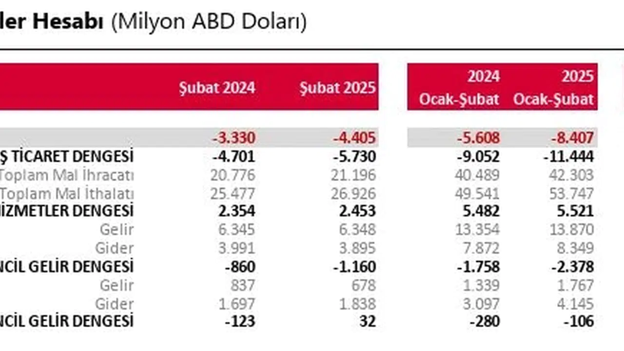 TCMB, Şubat 2025 dönemine ilişkin ödemeler dengesi istatistiklerini açıkladı. Buna göre; şubat ayında cari işlemler hesabı 4 milyar 405 milyon dolar açık verdi. Altın ve enerji hariç cari işlemler hesabında ise 2 milyar 158 milyon dolar fazla oluştu. Ödemeler dengesi tanımlı dış ticaret açığı 5 milyar 730 milyon dolar olarak gerçekleşti.