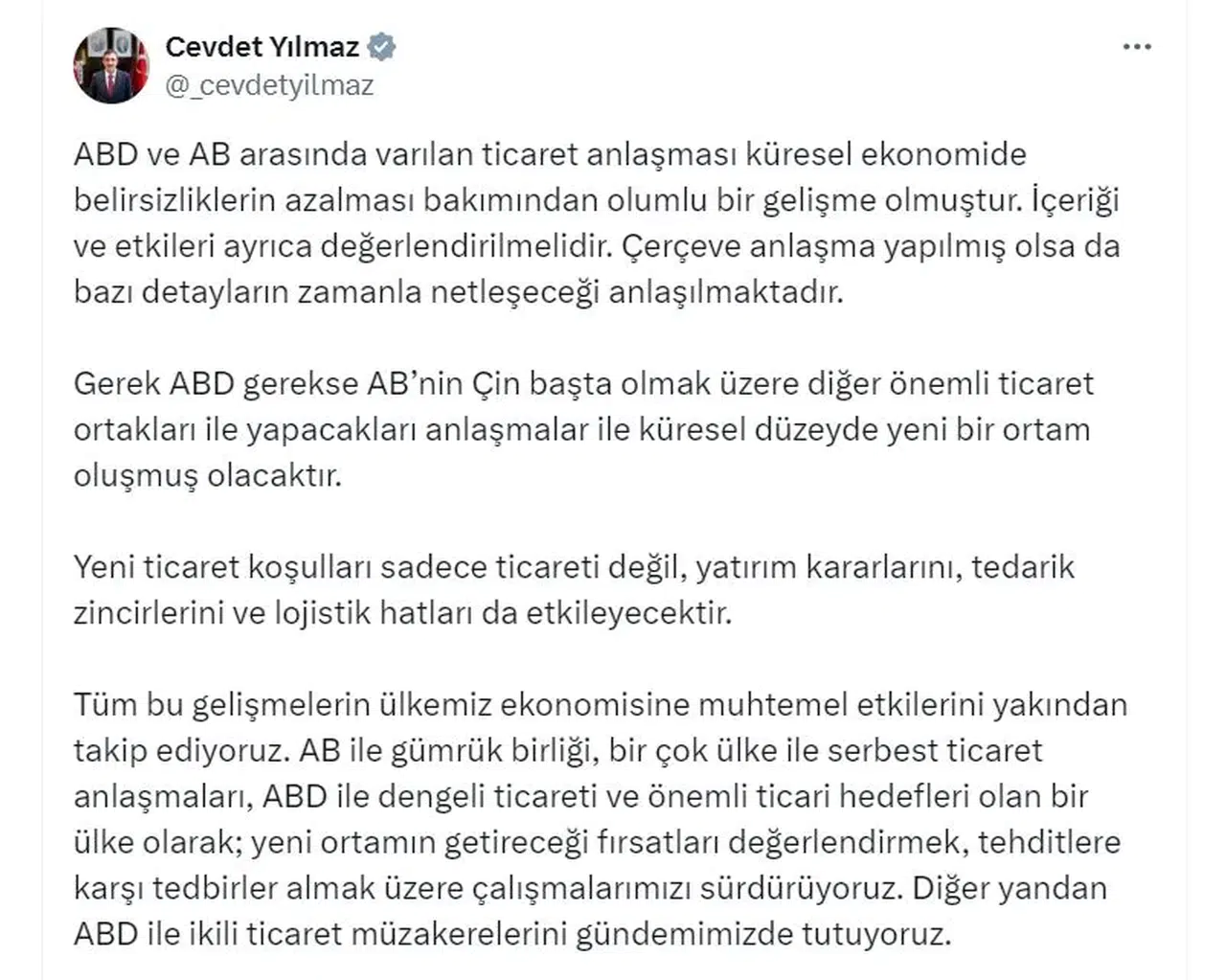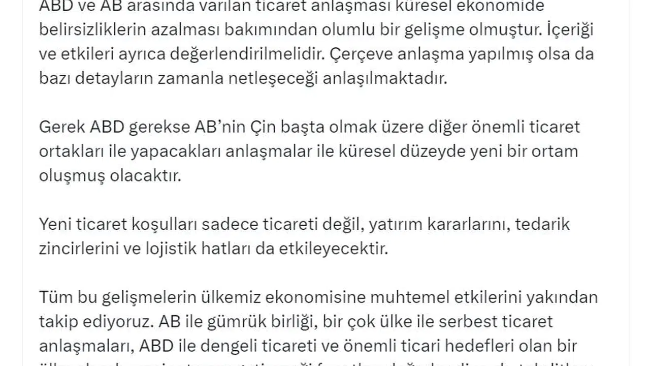Cumhurbaşkanı Yardımcısı Yılmaz, sosyal medya hesabından yaptığı açıklamada, "ABD ve AB arasında varılan ticaret anlaşması küresel ekonomide belirsizliklerin azalması bakımından olumlu bir gelişme olmuştur. İçeriği ve etkileri ayrıca değerlendirilmelidir. Çerçeve anlaşma yapılmış olsa da bazı detayların zamanla netleşeceği anlaşılmaktadır. Gerek ABD gerekse AB'nin Çin başta olmak üzere diğer önemli ticaret ortakları ile yapacakları anlaşmalar ile küresel düzeyde yeni bir ortam oluşmuş olacaktır. Yeni ticaret koşulları sadece ticareti değil, yatırım kararlarını, tedarik zincirlerini ve lojistik hatları da etkileyecektir. Tüm bu gelişmelerin ülkemiz ekonomisine muhtemel etkilerini yakından takip ediyoruz. AB ile gümrük birliği, birçok ülke ile serbest ticaret anlaşmaları, ABD ile dengeli ticareti ve önemli ticari hedefleri olan bir ülke olarak; yeni ortamın getireceği fırsatları değerlendirmek, tehditlere karşı tedbirler almak üzere çalışmalarımızı sürdürüyoruz. Diğer yandan ABD ile ikili ticaret müzakerelerini gündemimizde tutuyoruz" dedi.