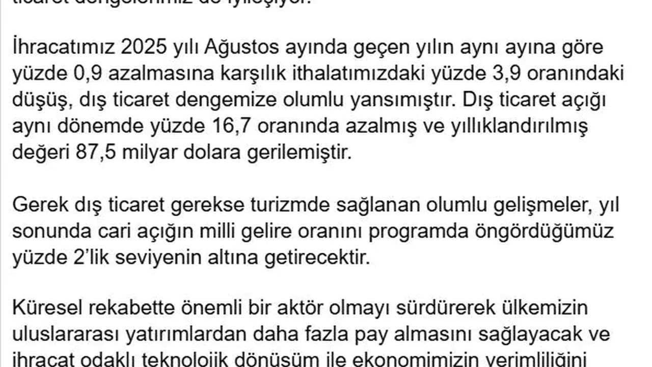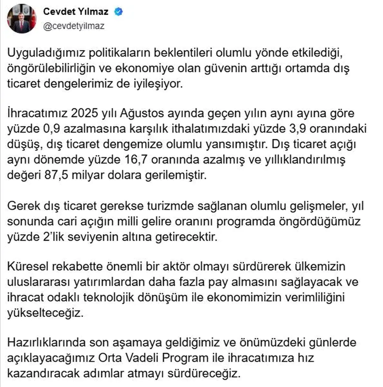 Cumhurbaşkanı Yardımcısı Cevdet Yılmaz, dış ticaret istatistiklerine ilişkin NSosyal hesabından açıklama yaptı. Yılmaz, "Uyguladığımız politikaların beklentileri olumlu yönde etkilediği, öngörülebilirliğin ve ekonomiye olan güvenin arttığı ortamda dış ticaret dengelerimiz de iyileşiyor. İhracatımız 2025 yılı Ağustos ayında geçen yılın aynı ayına göre yüzde 0,9 azalmasına karşılık ithalatımızdaki yüzde 3,9 oranındaki düşüş, dış ticaret dengemize olumlu yansımıştır. Dış ticaret açığı aynı dönemde yüzde 16,7 oranında azalmış ve yıllıklandırılmış değeri 87,5 milyar dolara gerilemiştir. Gerek dış ticaret gerekse turizmde sağlanan olumlu gelişmeler, yıl sonunda cari açığın milli gelire oranını, programda öngördüğümüz yüzde 2'lik seviyenin altına getirecektir. Küresel rekabette önemli bir aktör olmayı sürdürerek, ülkemizin uluslararası yatırımlardan daha fazla pay almasını sağlayacak ve ihracat odaklı teknolojik dönüşüm ile ekonomimizin verimliliğini yükselteceğiz. Hazırlıklarında son aşamaya geldiğimiz ve önümüzdeki günlerde açıklayacağımız Orta Vadeli Program ile ihracatımıza hız kazandıracak adımlar atmayı sürdüreceğiz" ifadelerini kullandı.