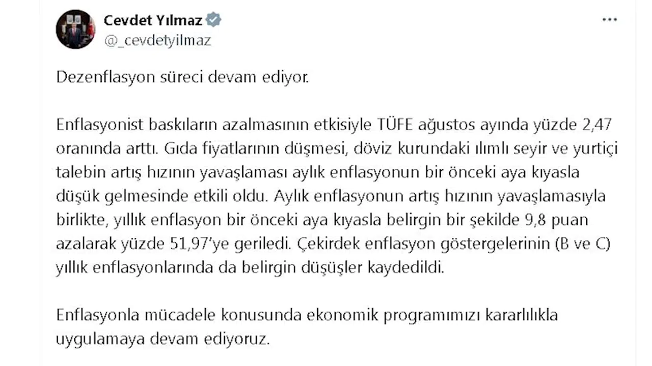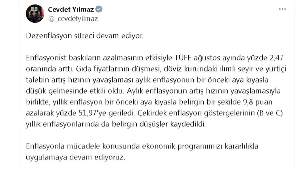 Cumhurbaşkanı Yardımcısı Cevdet Yılmaz, enflasyon verilerine ilişkin sosyal medya hesabından yaptığı açıklamada, "Dezenflasyon süreci devam ediyor. Enflasyonist baskıların azalmasının etkisiyle TÜFE ağustos ayında yüzde 2,47 oranında arttı. Gıda fiyatlarının düşmesi, döviz kurundaki ılımlı seyir ve yurt içi talebin artış hızının yavaşlaması aylık enflasyonun bir önceki aya kıyasla düşük gelmesinde etkili oldu. Aylık enflasyonun artış hızının yavaşlamasıyla birlikte, yıllık enflasyon bir önceki aya kıyasla belirgin bir şekilde 9,8 puan azalarak yüzde 51,97'ye geriledi. Çekirdek enflasyon göstergelerinin (B ve C) yıllık enflasyonlarında da belirgin düşüşler kaydedildi" ifadelerini kullandı.