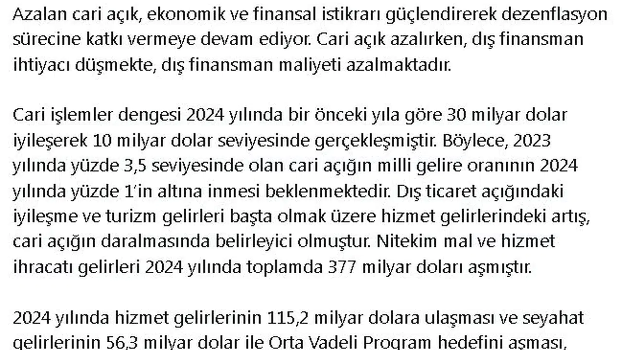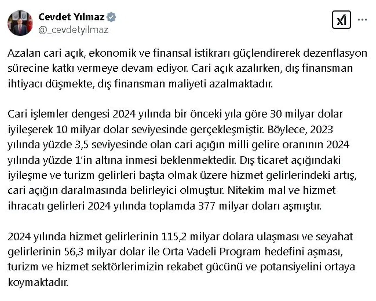 Cumhurbaşkanı Yardımcısı Cevdet Yılmaz, ödemeler dengesi istatistiklerine ilişkin sosyal medya hesabından yaptığı açıklamada, "Azalan cari açık, ekonomik ve finansal istikrarı güçlendirerek dezenflasyon sürecine katkı vermeye devam ediyor. Cari açık azalırken, dış finansman ihtiyacı düşmekte, dış finansman maliyeti azalmaktadır. Cari işlemler dengesi 2024 yılında bir önceki yıla göre 30 milyar dolar iyileşerek 10 milyar dolar seviyesinde gerçekleşmiştir. Böylece, 2023 yılında yüzde 3,5 seviyesinde olan cari açığın milli gelire oranının 2024 yılında yüzde 1'in altına inmesi beklenmektedir. Dış ticaret açığındaki iyileşme ve turizm gelirleri başta olmak üzere hizmet gelirlerindeki artış, cari açığın daralmasında belirleyici olmuştur. Nitekim mal ve hizmet ihracatı gelirleri 2024 yılında toplamda 377 milyar doları aşmıştır" dedi.
