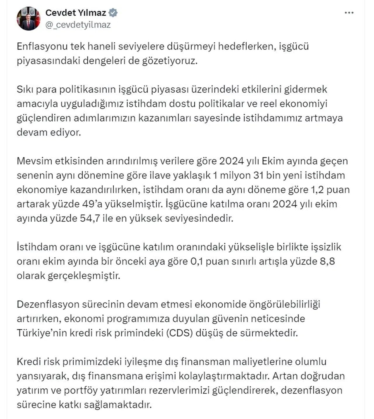 "Ekonomi programımıza duyulan güvenin neticesinde Türkiye'nin kredi risk primindeki (CDS) düşüş de sürmektedir. Kredi risk primimizdeki iyileşme dış finansman maliyetlerine olumlu yansıyarak, dış finansmana erişimi kolaylaştırmaktadır. Artan doğrudan yatırım ve portföy yatırımları rezervlerimizi güçlendirerek, dezenflasyon sürecine katkı sağlamaktadır. Fiyat istikrarı, ekonomide güven ortamını pekiştirerek sürdürebilir büyüme için güçlü bir zemin oluşturmaktadır. Bu doğrultuda dengeli ve istikrarlı büyüme için daha elverişli bir ortam oluşturarak, yatırım ve istihdamdaki artışla ekonomimizin potansiyelini ileriye taşımaya devam ediyoruz. Mesleki eğitim ve iş gücü piyasasına yönelik yapacağımız yapısal reformların katkısıyla yeni iş imkanları ortaya çıkararak, insan odaklı ve kapsayıcı kalkınma ile sosyal refahı kalıcı olarak artırmayı hedefliyoruz."