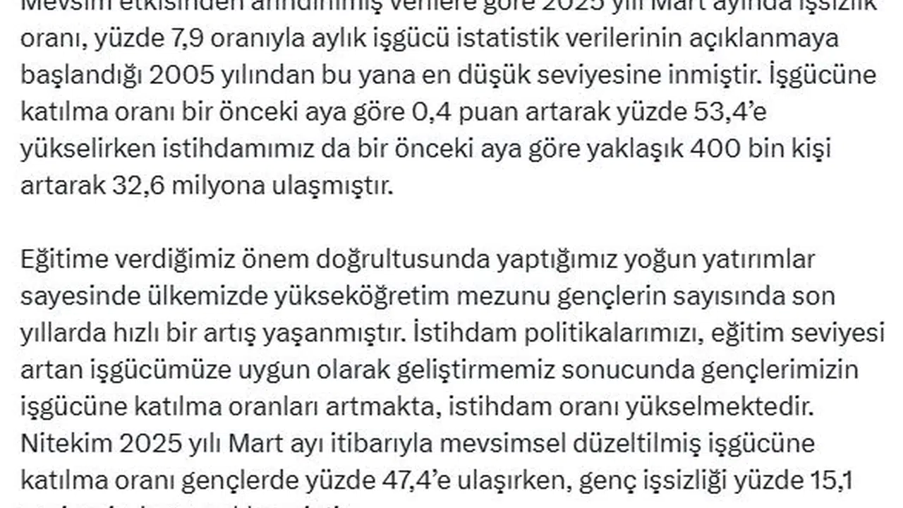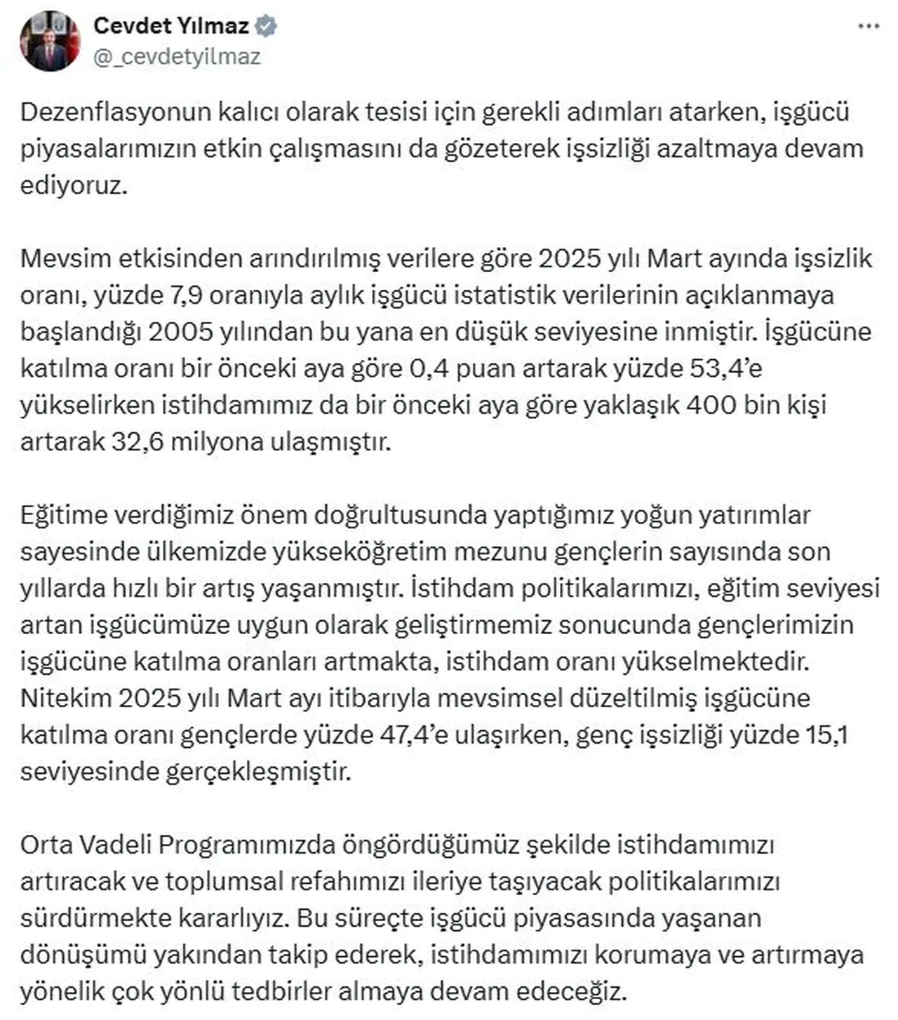 Cumhurbaşkanı Yardımcısı Cevdet Yılmaz, mart ayı iş gücü istatistiklerine ilişkin sosyal medya hesabından yaptığı açıklamada, "Dezenflasyonun kalıcı olarak tesisi için gerekli adımları atarken, iş gücü piyasalarımızın etkin çalışmasını da gözeterek işsizliği azaltmaya devam ediyoruz. Mevsim etkisinden arındırılmış verilere göre 2025 yılı Mart ayında işsizlik oranı, yüzde 7,9 oranıyla aylık iş gücü istatistik verilerinin açıklanmaya başlandığı 2005 yılından bu yana en düşük seviyesine inmiştir. İş gücüne katılma oranı bir önceki aya göre 0,4 puan artarak yüzde 53,4'e yükselirken istihdamımız da bir önceki aya göre yaklaşık 400 bin kişi artarak 32,6 milyona ulaşmıştır" dedi.