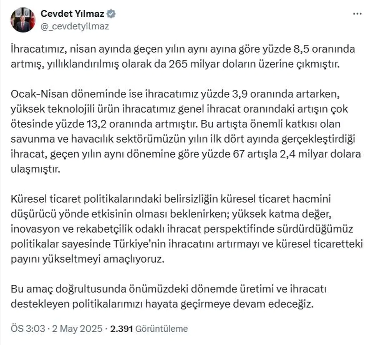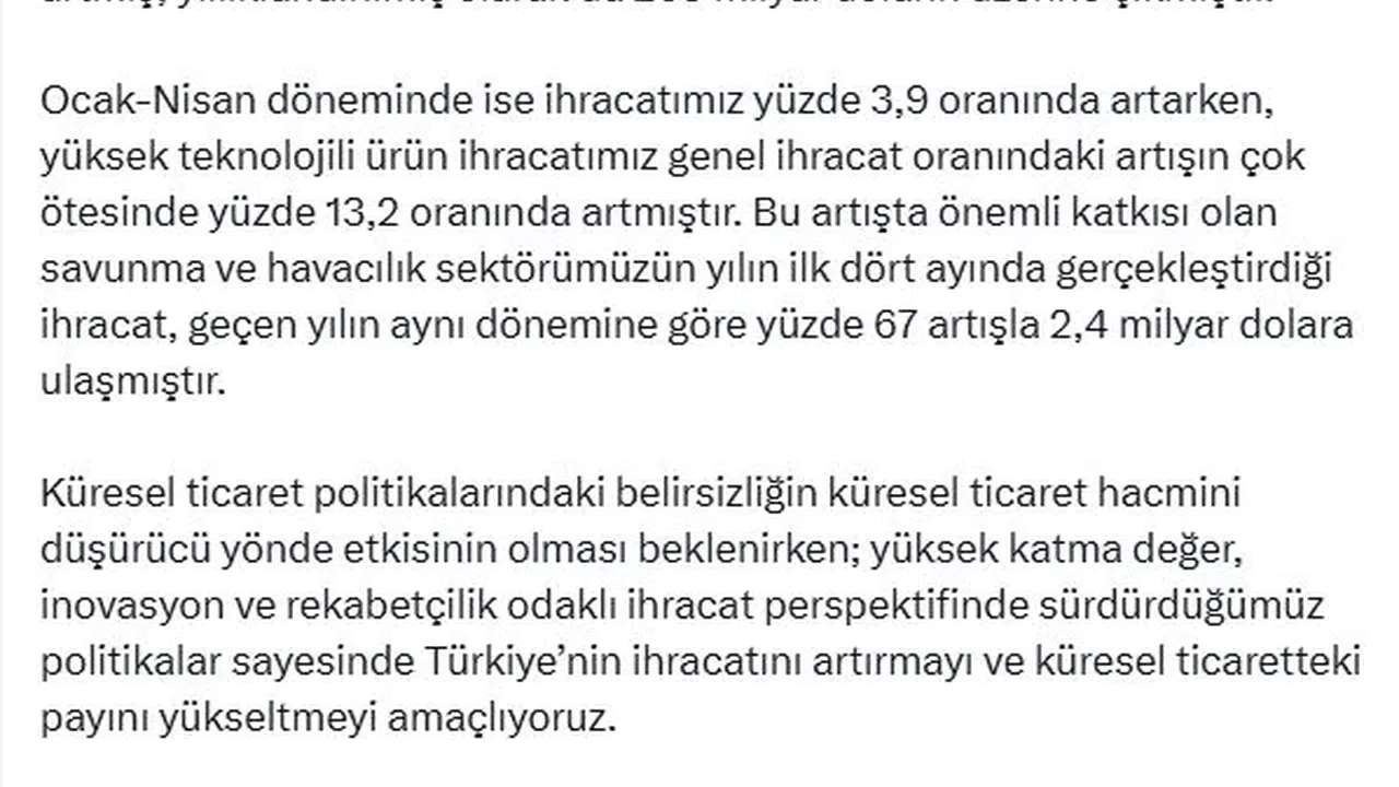 Cumhurbaşkanı Yardımcısı Cevdet Yılmaz, bugün açıklanan dış ticaret verilerine ilişkin sosyal medya hesabından yaptığı açıklamada, "İhracatımız, nisan ayında geçen yılın aynı ayına göre yüzde 8,5 oranında artmış, yıllıklandırılmış olarak da 265 milyar doların üzerine çıkmıştır. Ocak-nisan döneminde ise ihracatımız yüzde 3,9 oranında artarken, yüksek teknolojili ürün ihracatımız genel ihracat oranındaki artışın çok ötesinde yüzde 13,2 oranında artmıştır. Bu artışta önemli katkısı olan savunma ve havacılık sektörümüzün yılın ilk dört ayında gerçekleştirdiği ihracat, geçen yılın aynı dönemine göre yüzde 67 artışla 2,4 milyar dolara ulaşmıştır. Küresel ticaret politikalarındaki belirsizliğin küresel ticaret hacmini düşürücü yönde etkisinin olması beklenirken; yüksek katma değer, inovasyon ve rekabetçilik odaklı ihracat perspektifinde sürdürdüğümüz politikalar sayesinde Türkiye'nin ihracatını artırmayı ve küresel ticaretteki payını yükseltmeyi amaçlıyoruz" dedi. Yılmaz, önümüzdeki dönemde üretimi ve ihracatı destekleyen politikaları hayata geçirmeye devam edeceklerini kaydetti. (DHA)