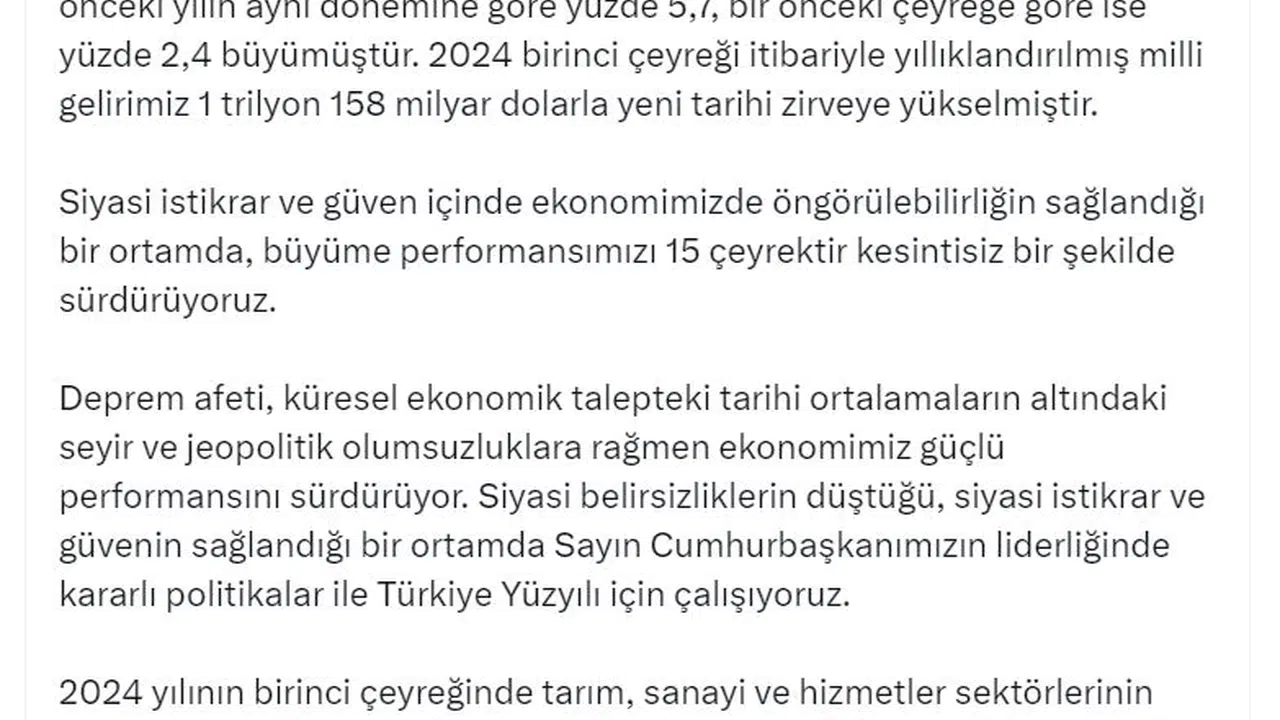 Cevdet Yılmaz, sosyal medya hesabından yaptığı açıklamada, Türkiye İstatistik Kurumu'nun (TÜİK) açıkladığı 2024 yılı 1'inci çeyrek gayrisafi yurt içi hasıla verilerine ilişkin değerlendirmede bulundu. Yılmaz, Türkiye ekonomisinin beklentilerin üzerinde, 2024 yılı birinci çeyreğinde bir önceki yılın aynı dönemine göre yüzde 5,7, bir önceki çeyreğe göre ise yüzde 2,4 büyüdüğünü belirterek, "2024 birinci çeyreği itibariyle yıllıklandırılmış milli gelirimiz 1 trilyon 158 milyar dolarla yeni tarihi zirveye yükselmiştir. Siyasi istikrar ve güven içinde ekonomimizde öngörülebilirliğin sağlandığı bir ortamda, büyüme performansımızı 15 çeyrektir kesintisiz bir şekilde sürdürüyoruz. Deprem afeti, küresel ekonomik talepteki tarihi ortalamaların altındaki seyir ve jeopolitik olumsuzluklara rağmen ekonomimiz güçlü performansını sürdürüyor. Siyasi belirsizliklerin düştüğü, siyasi istikrar ve güvenin sağlandığı bir ortamda Sayın Cumhurbaşkanımızın liderliğinde kararlı politikalar ile Türkiye Yüzyılı için çalışıyoruz" dedi.
