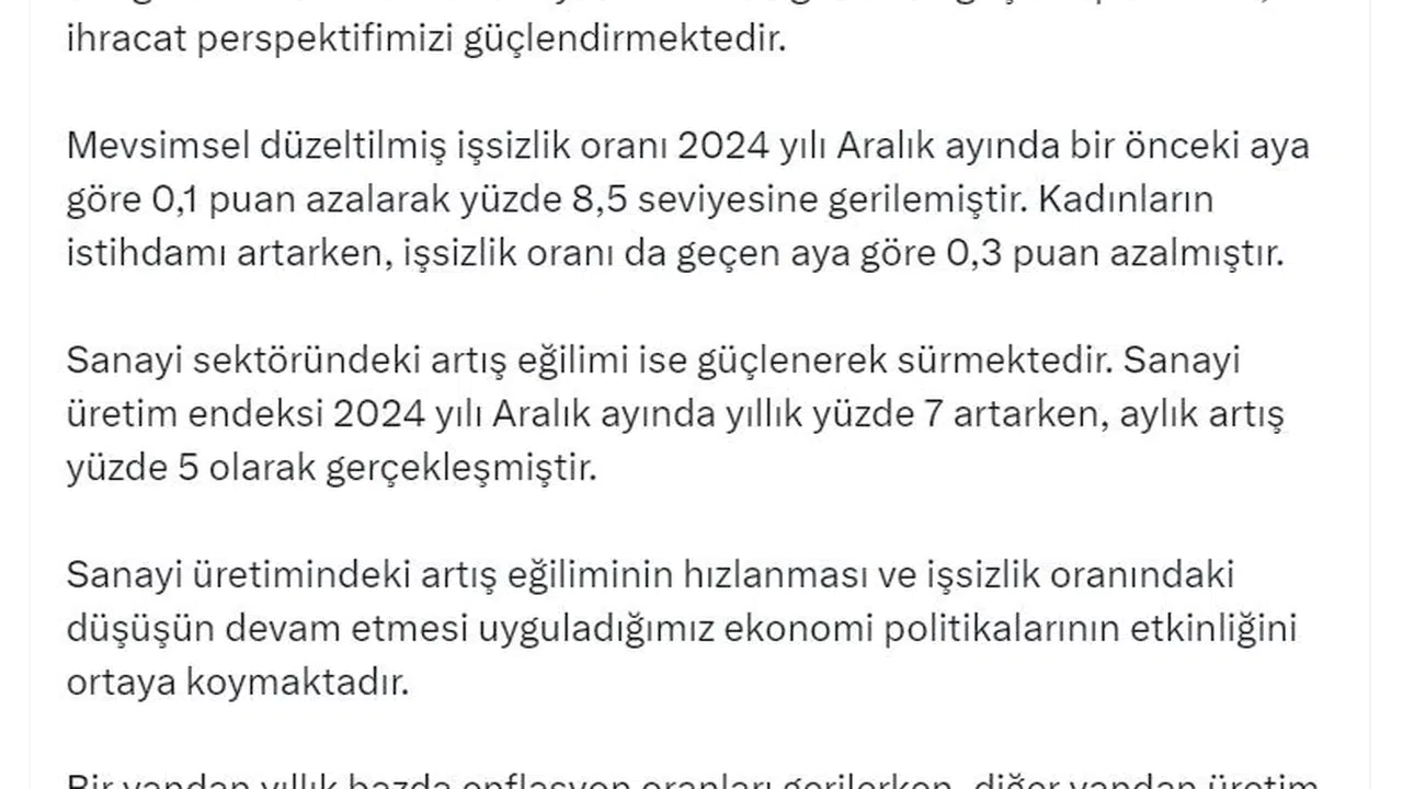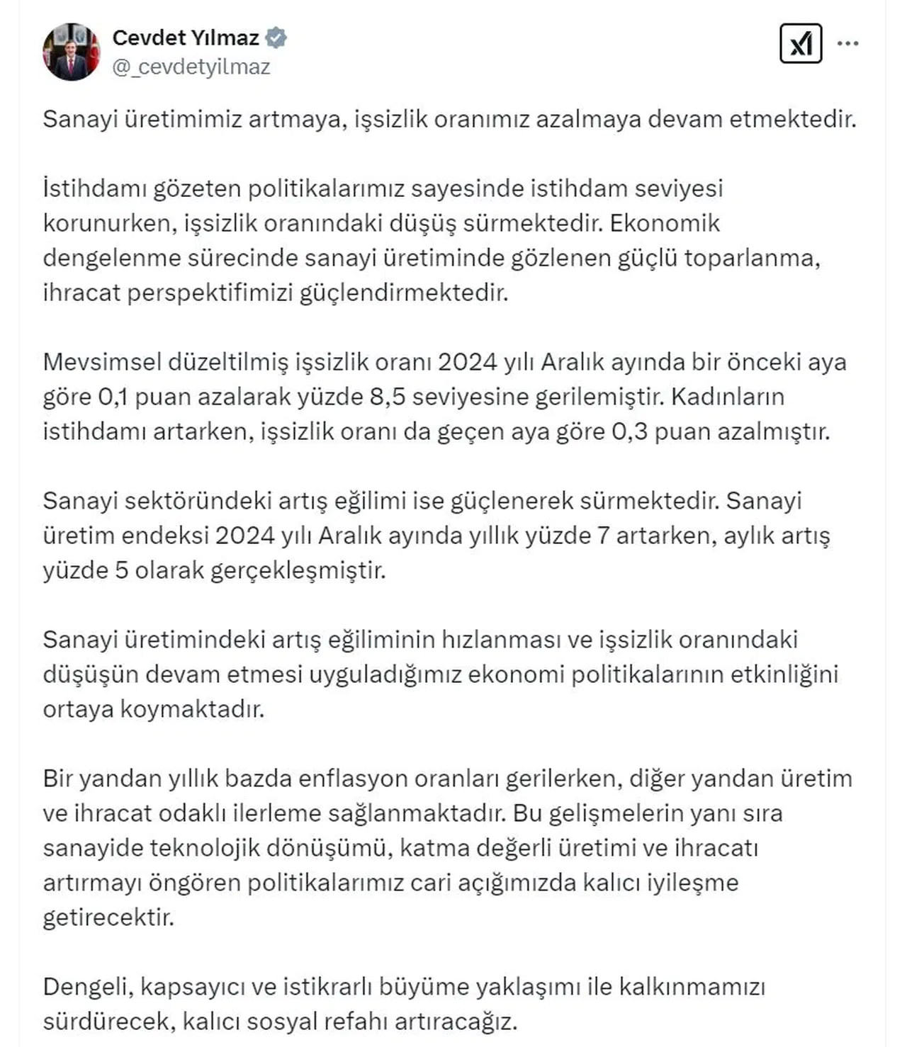 Cumhurbaşkanı Yardımcısı Yılmaz, Türkiye İstatistik Kurumu'nun açıkladığı aralık ayı sanayi üretim endeksi ve işgücü istatistiklerine ilişkin değerlendirmede bulundu. Yılmaz, sosyal medya hesabından yaptığı açıklamada, "Sanayi üretimimiz artmaya, işsizlik oranımız azalmaya devam etmektedir. İstihdamı gözeten politikalarımız sayesinde istihdam seviyesi korunurken, işsizlik oranındaki düşüş sürmektedir. Ekonomik dengelenme sürecinde sanayi üretiminde gözlenen güçlü toparlanma, ihracat perspektifimizi güçlendirmektedir. Mevsimsel düzeltilmiş işsizlik oranı 2024 yılı aralık ayında bir önceki aya göre 0,1 puan azalarak yüzde 8,5 seviyesine gerilemiştir. Kadınların istihdamı artarken, işsizlik oranı da geçen aya göre 0,3 puan azalmıştır" dedi.