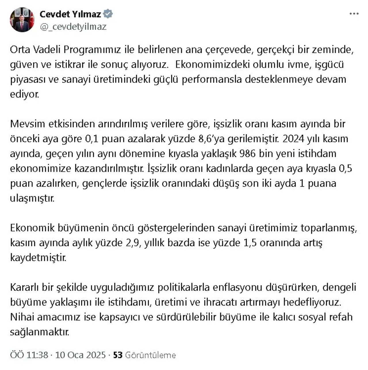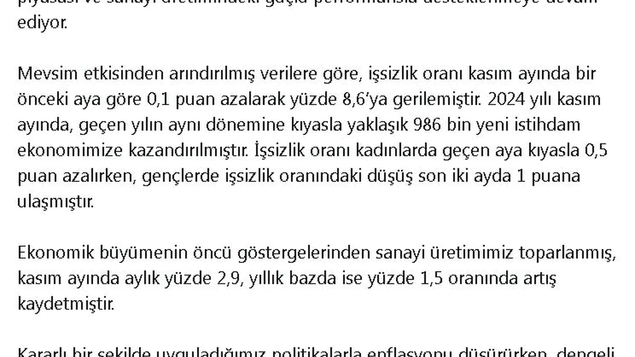 Cumhurbaşkanı Yardımcısı Cevdet Yılmaz, kasım ayı iş gücü ve sanayi üretimi istatistiklerine ilişkin, sosyal medya hesabından yaptığı açıklamada, "Orta Vadeli Programımız ile belirlenen ana çerçevede, gerçekçi bir zeminde, güven ve istikrar ile sonuç alıyoruz. Ekonomimizdeki olumlu ivme, iş gücü piyasası ve sanayi üretimindeki güçlü performansla desteklenmeye devam ediyor. Mevsim etkisinden arındırılmış verilere göre, işsizlik oranı kasım ayında bir önceki aya göre 0,1 puan azalarak yüzde 8,6'ya gerilemiştir. 2024 yılı Kasım ayında, geçen yılın aynı dönemine kıyasla yaklaşık 986 bin yeni istihdam ekonomimize kazandırılmıştır. İşsizlik oranı kadınlarda geçen aya kıyasla 0,5 puan azalırken, gençlerde işsizlik oranındaki düşüş son 2 ayda 1 puana ulaşmıştır" ifadelerini kullandı.