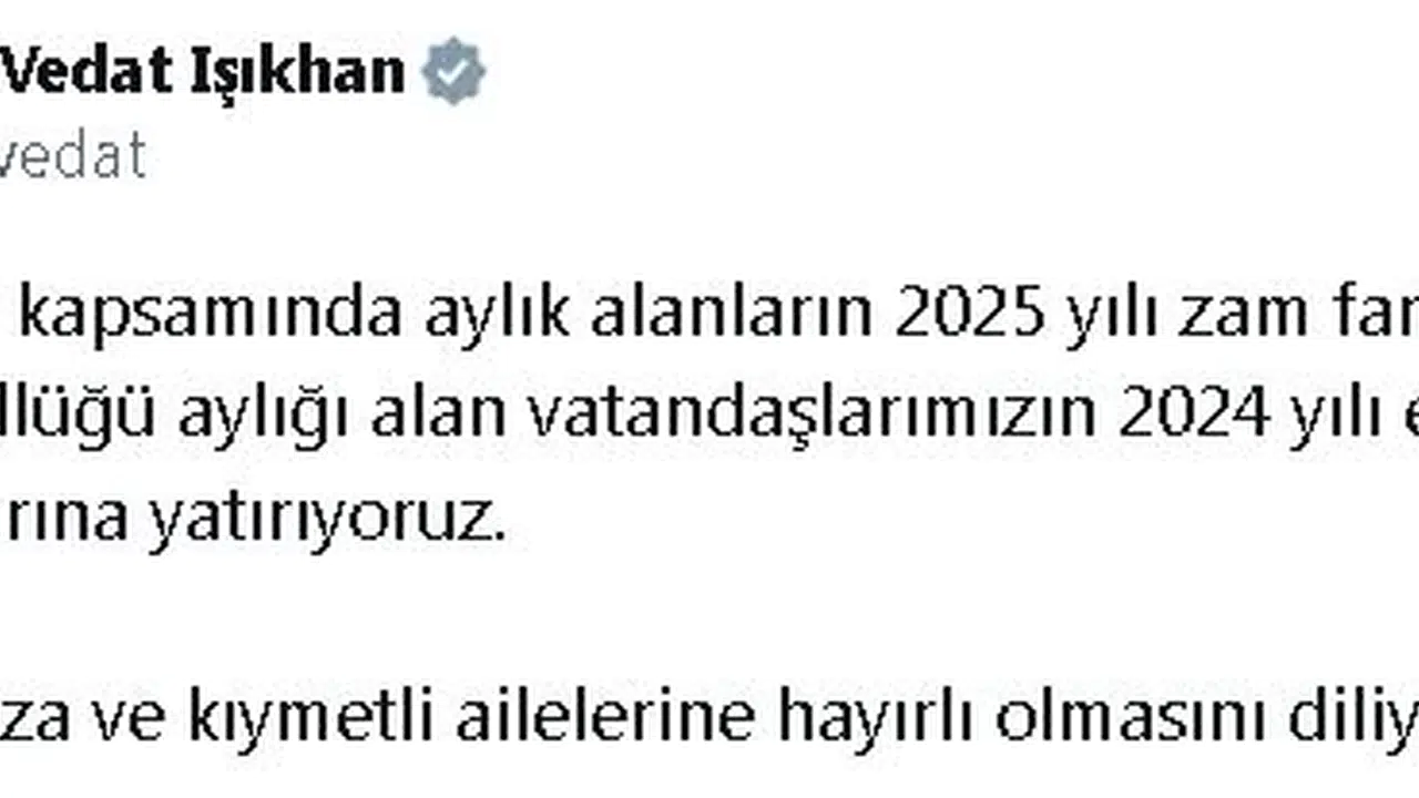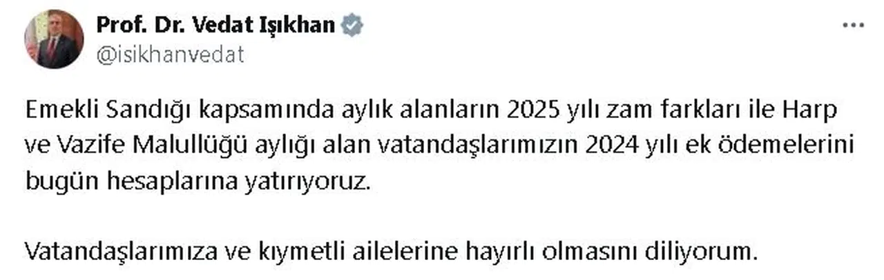 Bakan Işıkhan, sosyal medya hesabından yaptığı açıklamada, "Emekli Sandığı kapsamında aylık alanların, 2025 yılı zam farkları ile Harp ve Vazife Malullüğü Aylığı alan vatandaşlarımızın 2024 yılı ek ödemelerini bugün hesaplarına yatırıyoruz. Vatandaşlarımıza ve kıymetli ailelerine hayırlı olmasını diliyorum" dedi.