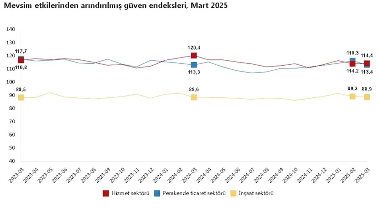 TÜİK, Mart 2025 dönemine ilişkin hizmet, perakende ticaret ve inşaat güven endekslerini açıkladı. Buna göre; güven endeksi mart ayında bir önceki aya göre hizmet sektöründe yüzde 0,2 oranında artarak 114,4 değerini, perakende ticaret sektöründe yüzde 2,5 oranında azalarak 113,4 değerini ve inşaat sektöründe yüzde 0,5 oranında azalarak 88,9 değerini aldı. (DHA)