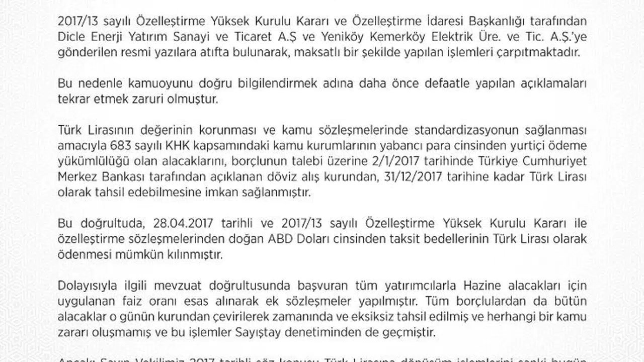 Bakanlığın sosyal medya hesabından yapılan açıklamada, "CHP Zonguldak Milletvekili Sayın Deniz Yavuzyılmaz, yanlış bilgilerle sosyal medya hesabından kamuoyunu sürekli bir şekilde yanıltmaya devam etmektedir. 2017/13 sayılı Özelleştirme Yüksek Kurulu Kararı ve Özelleştirme İdaresi Başkanlığı tarafından Dicle Enerji Yatırım Sanayi ve Ticaret A.Ş. ve Yeniköy Kemerköy Elektrik Üre. ve Tic. A.Ş.'ye gönderilen resmi yazılara atıfta bulunarak, maksatlı bir şekilde yapılan işlemleri çarpıtmaktadır. Bu nedenle kamuoyunu doğru bilgilendirmek adına daha önce defaatle yapılan açıklamaları tekrar etmek zaruri olmuştur. TL'nin değerinin korunması ve kamu sözleşmelerinde standardizasyonun sağlanması amacıyla 683 sayılı KHK (Kanun Hükmünde Kararname) kapsamındaki kamu kurumlarının yabancı para cinsinden yurt içi ödeme yükümlülüğü olan alacaklarını, borçlunun talebi üzerine 2 Ocak 2017 tarihinde Türkiye Cumhuriyet Merkez Bankası tarafından açıklanan döviz alış kurundan, 31 Aralık 2017 tarihine kadar TL olarak tahsil edebilmesine imkan sağlanmıştır. Bu doğrultuda, 28 Nisan 2017 tarihli ve 2017/13 sayılı Özelleştirme Yüksek Kurulu Kararı ile özelleştirme sözleşmelerinden doğan ABD doları cinsinden taksit bedellerinin TL olarak ödenmesi mümkün kılınmıştır. Dolayısıyla ilgili mevzuat doğrultusunda başvuran tüm yatırımcılarla Hazine alacakları için uygulanan faiz oranı esas alınarak ek sözleşmeler yapılmıştır. Tüm borçlulardan da bütün alacaklar o günün kurundan çevrilerek zamanında ve eksiksiz tahsil edilmiş ve herhangi bir kamu zararı oluşmamış ve bu işlemler Sayıştay denetiminden de geçmiştir. Ancak Sayın Vekilimiz, 2017 tarihli söz konusu TL'ye dönüşüm işlemlerini sanki bugün yeni yapılmış gibi bir algı oluşturmak istemekte ve tahsilatları tamamlanmış alacakları afaki şekilde 2024 yılı güncel döviz kurları ile yeniden hesaplamaya kalkmıştır. Sayın vekilin siyasi saiklerle yaptığı anlaşılan bu iddialara kamuoyunun itibar etmemesi önemle rica olunur" ifadelerine yer verildi. (DHA)