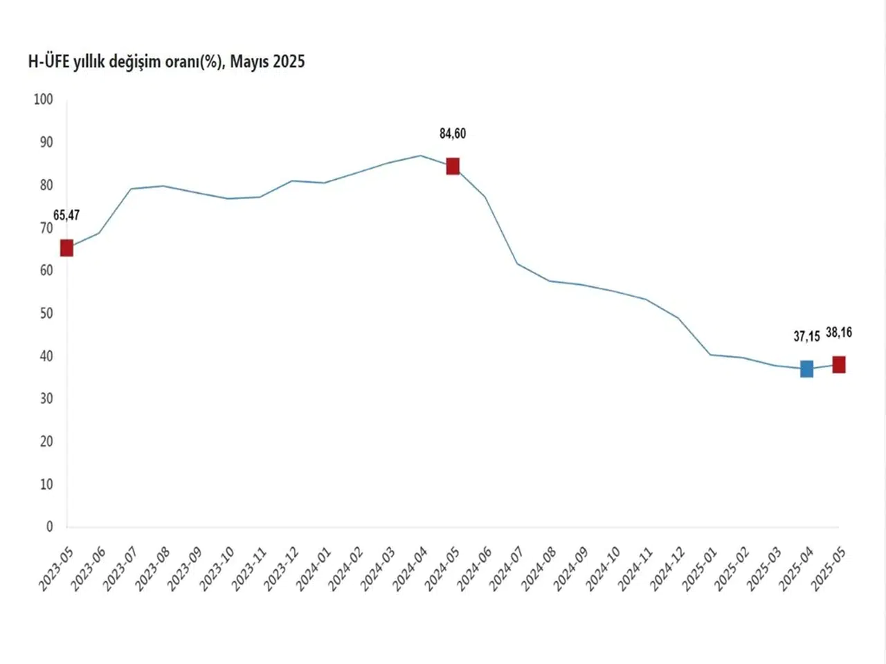 TÜİK, H-ÜFE Mayıs 2025 verilerini açıkladı. Buna göre, H-ÜFE, 2025 yılı mayıs ayında bir önceki aya göre yüzde 2,37 artış, bir önceki yılın aralık ayına göre yüzde 21,42 artış, bir önceki yılın aynı ayına göre yüzde 38,16 artış ve 12 aylık ortalamalara göre yüzde 48,65 artış gösterdi.