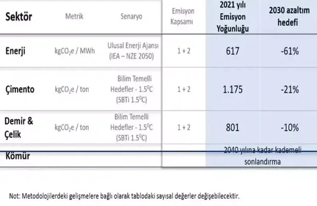 Banka ilk olarak karbon yoğun sektörlerden enerji üretimi, çimento ve demir çelik sektörlerinde emisyon azaltımına ilişkin 2030 yılı hedeflerini açıkladı. Buna göre, 2030 yılına kadar emisyon yoğunluğunun 2021 baz yılına göre enerji sektöründe yüzde 61, çimentoda yüzde 21 ve demir-çelikte yüzde 10 azaltılması hedefleniyor. Belirlenen hedefler, Bankanın sürdürülebilirlik stratejisinin temel bir unsurunu temsil ediyor ve müşterilerinin yeşil dönüşümünde yol gösterici bir iş ortağı olma amacını yansıtıyor.