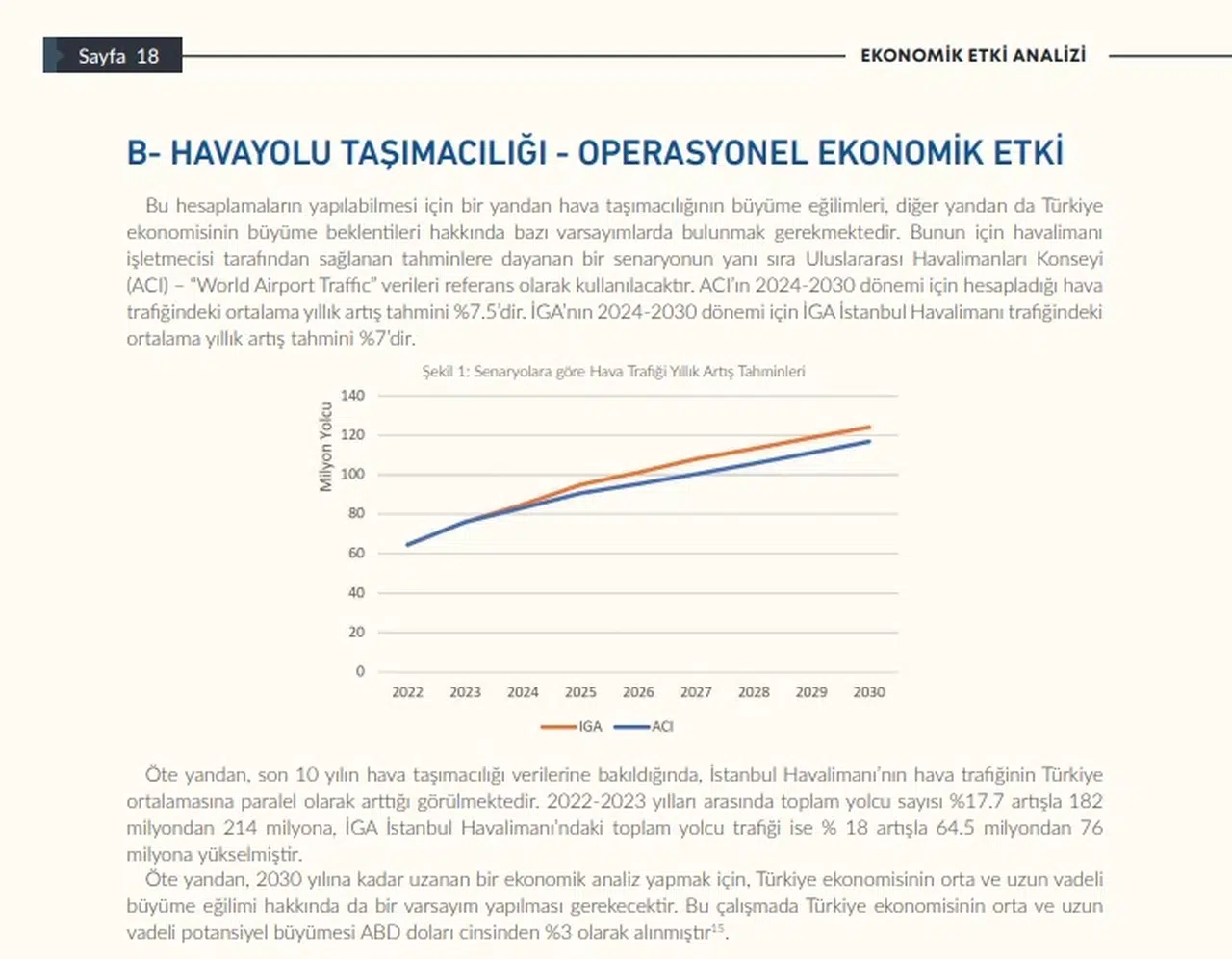 "Bu araştırma; doğrudan, dolaylı ve tetikleyici ekonomik etkiler üzerinden yapıldı. Çeşitli senaryoların çalışıldığı analizde; bağımsız bir kuruluş olan Uluslararası Havalimanları Konseyi'nin (ACI) öngördüğü veriler değerlendirildi. Bir diğer senaryo içinse İGA'nın büyüme projeksiyonları temel alındı. İki kurumun verileri ışığında hazırlanan analizlerin birbirleriyle tutarlı oldukları, yakın sonuçlara işaret ettikleri görüldü. Öte yandan araştırmamızda öncelikle, geriye dönük gerçekleşmiş veriler üzerinden 2022 ve 2023 yılları için bir ekonomik etki hesaplandı. Burada, baz yılı niteliğinde 2022'nin ele alınmasının nedeni, dolaylı ekonomik etkilerin ortaya konulması için gerekli Türkiye ekonomisine dair TÜİK tabanlı ayrıntılı sektörel verinin 2022 yılı için mevcut olmasıydı. İGA İstanbul Havalimanı'nın 2023 yılındaki 'ekonomik etkisi'nin ölçümlenmesi tamamlandıktan sonra ikinci aşamaya, yani 2030 projeksiyonuna geçildi. Burada da farklı senaryolar temelinde doğrudan, dolaylı ve tetikleyici ekonomik etki analizleri tekrarlandı ve Türkiye ekonomisinin ABD doları bazında her yıl yüzde 3 oranında büyüyeceği, emek verimliliğinin yıllık yüzde 2 artacağı ve hanehalkı tüketim eğilimlerinin sabit kalacağı varsayıldı. Havalimanı faaliyetleri ve istihdam ilişkisi de baz yıl hesaplamalarına dayanarak sabit kabul edildi."