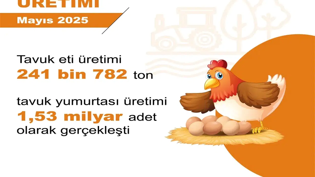 TÜİK, Mayıs 2025 dönemine ilişkin kümes hayvancılığı ile süt ve süt ürünleri üretimi verilerini açıkladı. Buna göre; mayıs ayında bir önceki yılın aynı ayına göre, tavuk yumurtası üretimi yüzde 13,5 azaldı, kesilen tavuk sayısı yüzde 8,8 arttı, tavuk eti üretimi yüzde 11,7 arttı. Ocak-mayıs döneminde bir önceki yılın aynı dönemine göre, tavuk yumurtası üretimi yüzde 10,5 azaldı, kesilen tavuk sayısı yüzde 11 arttı, tavuk eti üretimi yüzde 14,1 arttı. Bir önceki ay 237 bin 567 ton olan tavuk eti üretimi mayıs ayında yüzde 1,8 oranında artarak 241 bin 782 ton oldu. Bir önceki ay 1 milyar 551 milyon 765 bin adet olan tavuk yumurtası üretimi mayıs ayında yüzde 1,6 oranında azalarak 1 milyar 526 milyon 665 bin adet oldu.