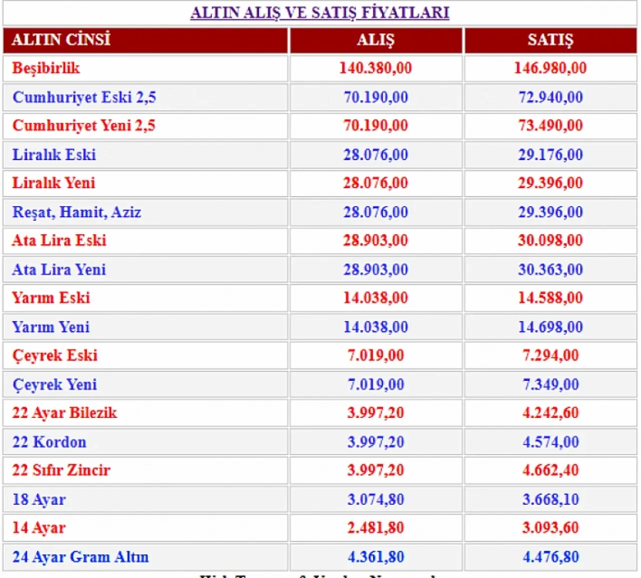 Beşibirlik: 140.380,00 TL (Alış) - 146.980,00 TL (Satış)