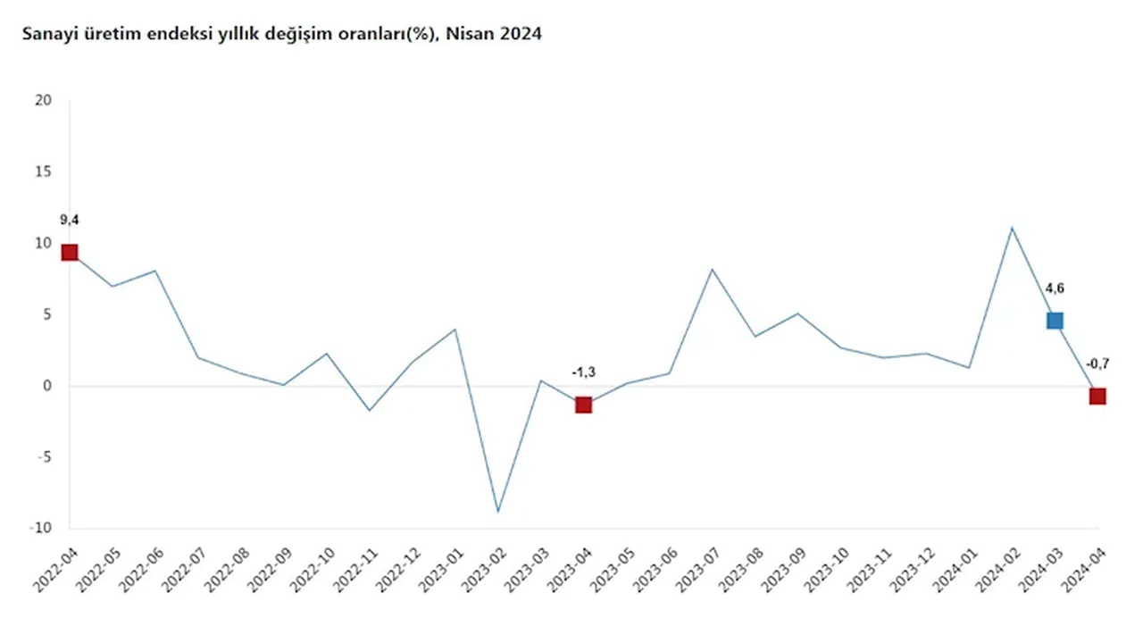 TÜİK, Nisan 2024 dönemine ilişkin sanayi üretim endeksi verilerini açıkladı. Buna göre; sanayi üretimi nisan ayında bir önceki yılın aynı ayına göre yüzde 0,7 azaldı. Sanayinin alt sektörleri incelendiğinde, madencilik ve taş ocakçılığı sektörü endeksi bir önceki yılın aynı ayına göre yüzde 12,2 arttı, imalat sanayi sektörü endeksi yüzde 1,5 azaldı ve elektrik, gaz, buhar ve iklimlendirme üretimi ve dağıtımı sektörü endeksi yüzde 1,6 arttı.