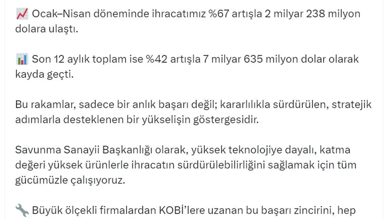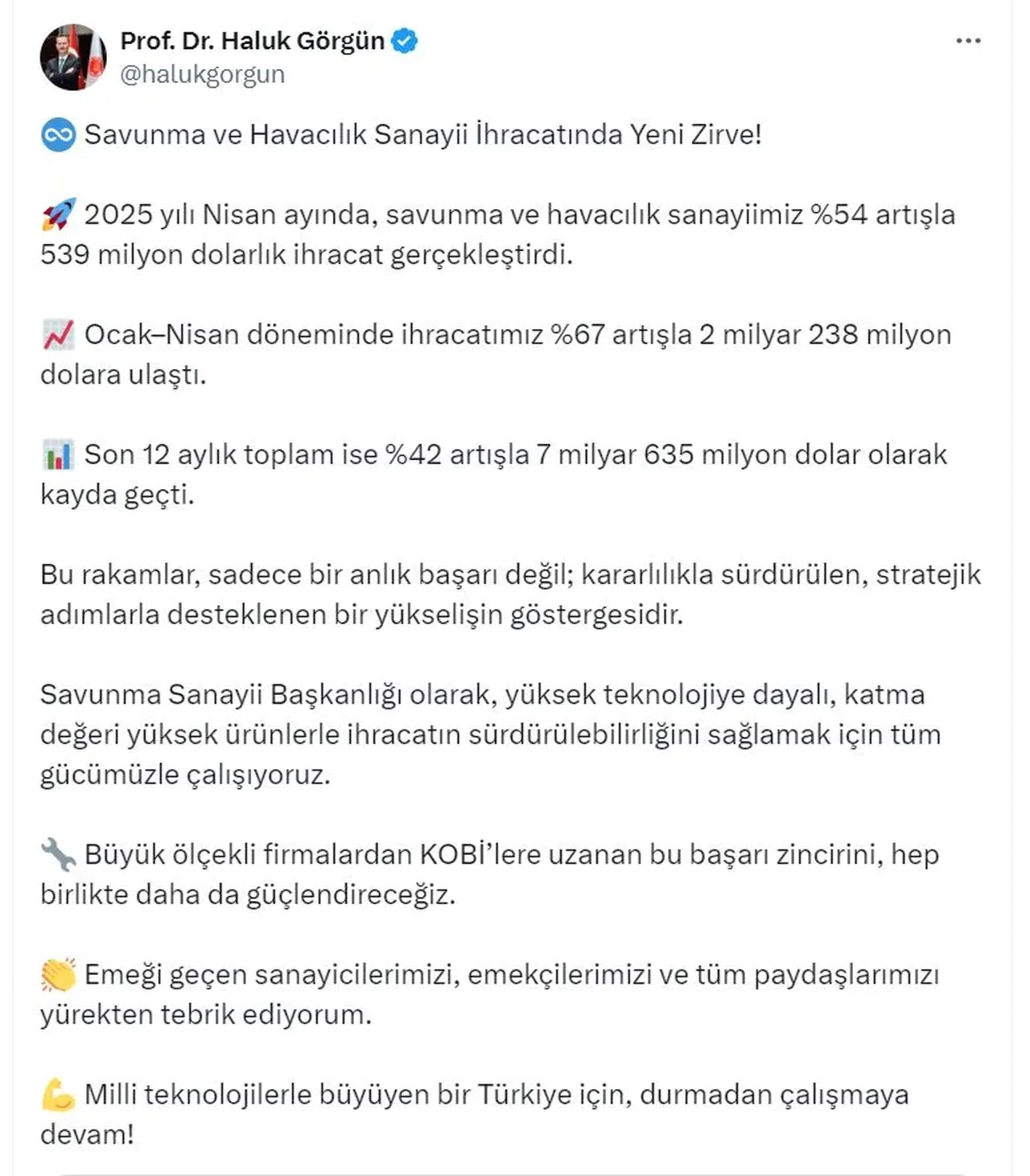 Savunma Sanayii Başkanı Görgün, sosyal medya hesabından yaptığı açıklamada, savunma ve havacılık sanayii ihracatında yeni zirvenin gerçekleştiğini belirterek, "2025 yılı Nisan ayında, savunma ve havacılık sanayiimiz yüzde 54 artışla 539 milyon dolarlık ihracat gerçekleştirdi. Ocak-nisan döneminde ihracatımız yüzde 67 artışla 2 milyar 238 milyon dolara ulaştı. Son 12 aylık toplam ise yüzde 42 artışla 7 milyar 635 milyon dolar olarak kayda geçti. Bu rakamlar, sadece bir anlık başarı değil; kararlılıkla sürdürülen, stratejik adımlarla desteklenen bir yükselişin göstergesidir. Savunma Sanayii Başkanlığı olarak, yüksek teknolojiye dayalı, katma değeri yüksek ürünlerle ihracatın sürdürülebilirliğini sağlamak için tüm gücümüzle çalışıyoruz. Büyük ölçekli firmalardan KOBİ'lere uzanan bu başarı zincirini, hep birlikte daha da güçlendireceğiz. Emeği geçen sanayicilerimizi, emekçilerimizi ve tüm paydaşlarımızı yürekten tebrik ediyorum. Milli teknolojilerle büyüyen bir Türkiye için durmadan çalışmaya devam" ifadelerini kullandı. (DHA)
