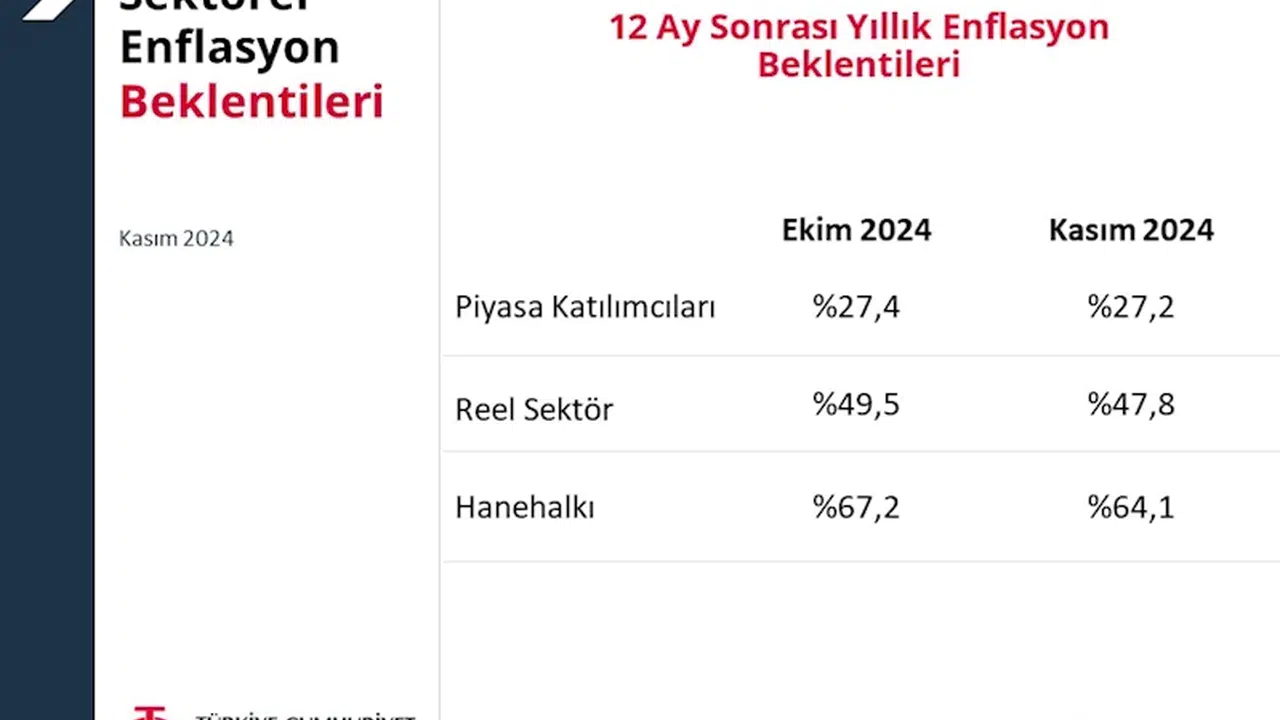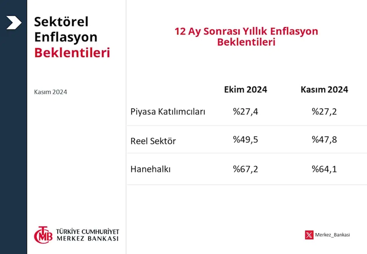 Caner ÜNVER/ANKARA, (DHA)- TÜRKİYE Cumhuriyet Merkez Bankası (TCMB), 12 ay sonrası yıllık enflasyon beklentilerinin piyasa katılımcıları, reel sektör ve hane halkı için gerilediğini açıkladı.