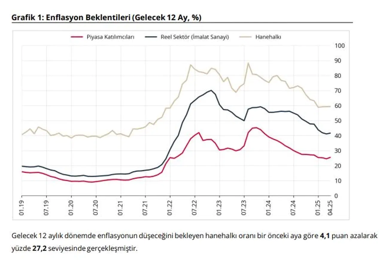 TCMB, Nisan 2025 dönemine ilişkin sektörel enflasyon beklentilerini açıkladı. Buna göre; 12 ay sonrası yıllık enflasyon beklentileri bir önceki aya göre, piyasa katılımcıları için 1 puan artarak yüzde 25,6 seviyesine, reel sektör için 0,6 puan artarak yüzde 41,7 seviyesine yükselirken, hanehalkı için değişmeyerek yüzde 59,3 seviyesinde gerçekleşti. Gelecek 12 aylık dönemde enflasyonun düşeceğini bekleyen hanehalkı oranı, bir önceki aya göre 4,1 puan azalarak yüzde 27,2 seviyesinde gerçekleşti. (DHA)