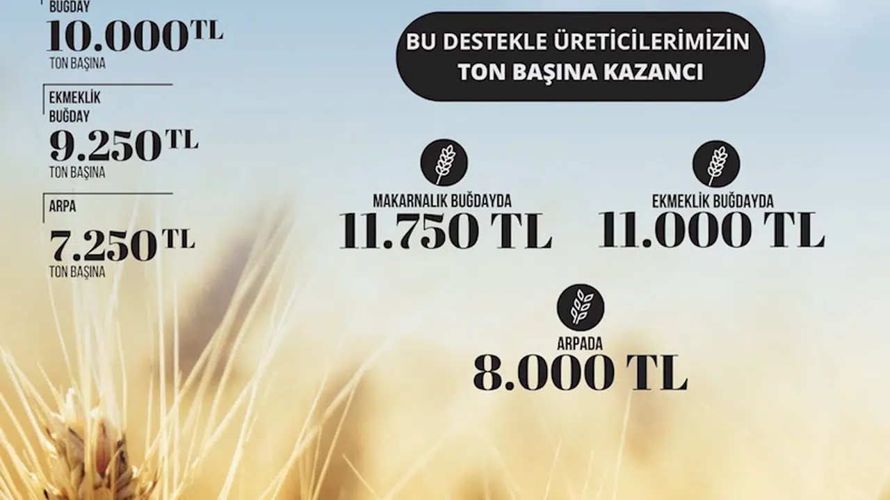 "Hububat hasadı şu anda ülke genelinde yaklaşık %5 seviyelerindedir. 14 Mayıs 2024 tarihinden itibaren üreticilerimize depolama imkânı sağlamak amacıyla TMO'ya arz edilen ürünler teslim alınmaya başlanmıştır. Hasat başlangıcından bugüne kadar gelinen süreçte piyasalar yakından takip edilerek, bu gün itibariyle TMO hububat alım fiyatları ve fark ödemesi desteklerinin açıklanmasına karar verilmiştir. 2024 mahsulü hububat alım fiyatları (2. gruplar için) ton başına; makarnalık buğdayda 10 bin lira, ekmeklik buğdayda 9 bin 250 lira, arpada 7 bin 250 lira olarak belirlenmiştir. Bakanlığımızca, Çiftçi Kayıt Sistemine kayıtlı üreticilerimize buğday için ton başına bin 750 liraya kadar, arpa için ton başına 750 liraya kadar fark ödemesi desteği verilecektir. Bakanlığımızca verilecek fark ödemesi desteği ile birlikte üreticilerimizin eline ton başına; makarnalık buğdayda 11 bin 750 lira, ekmeklik buğdayda 11 bin lira, arpada 8 bin lira geçecektir."