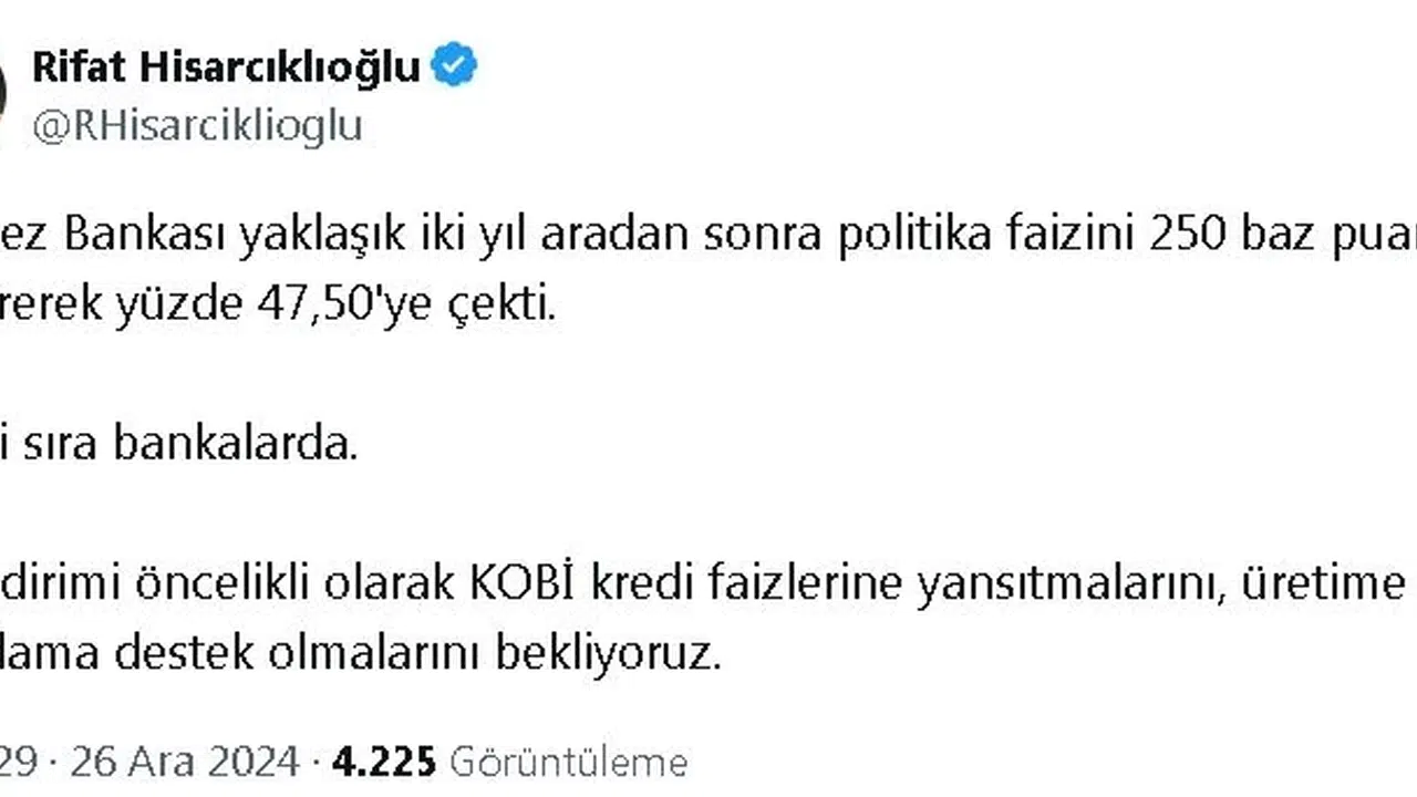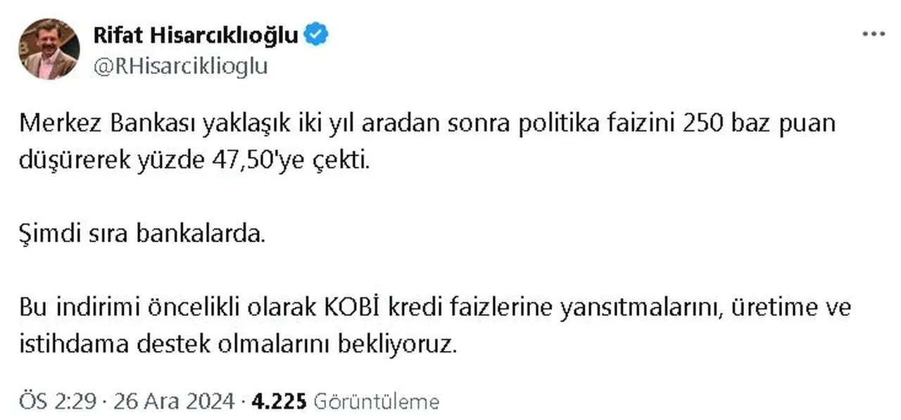 TOBB Başkanı Hisarcıklıoğlu, sosyal medya hesabından yaptığı açıklamada, "Merkez Bankası yaklaşık 2 yıl aradan sonra politika faizini 250 baz puan düşürerek yüzde 47,50'ye çekti. Şimdi sıra bankalarda. Bu indirimi öncelikli olarak KOBİ kredi faizlerine yansıtmalarını, üretime ve istihdama destek olmalarını bekliyoruz" ifadelerini kullandı. (DHA)