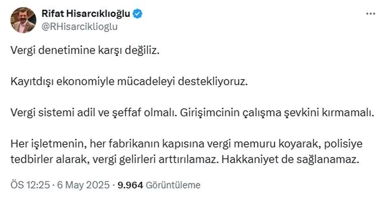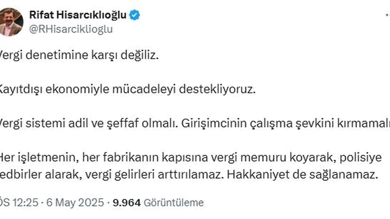 TOBB Başkanı Hisarcıklıoğlu, sosyal medya hesabından yaptığı açıklamada, "Vergi denetimine karşı değiliz. Kayıt dışı ekonomiyle mücadeleyi destekliyoruz. Vergi sistemi adil ve şeffaf olmalı. Girişimcinin çalışma şevkini kırmamalı. Her işletmenin, her fabrikanın kapısına vergi memuru koyarak, polisiye tedbirler alarak, vergi gelirleri arttırılamaz. Hakkaniyet de sağlanamaz" dedi. (DHA)