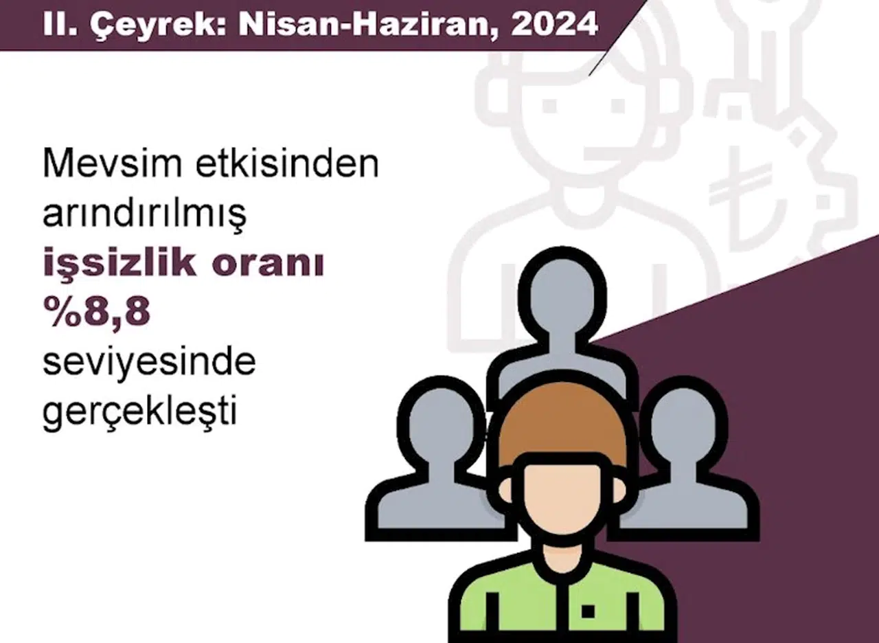 ANKARA, (DHA)- TÜRKİYE İstatistik Kurumu (TÜİK), 2024 yılı 2'nci çeyreğinde (Nisan-Haziran 2024) işsizlik oranının, bir önceki çeyreğe göre değişim göstermeyerek yüzde 8,8 olarak gerçekleştiğini açıkladı.