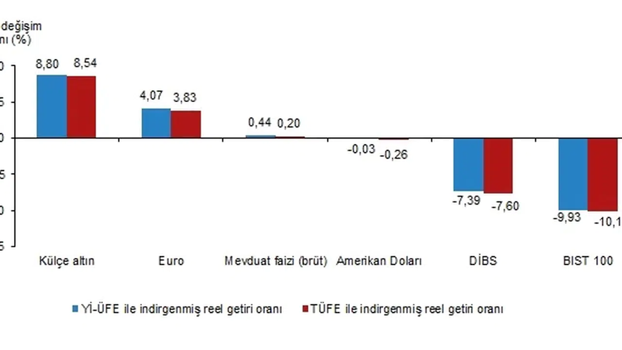 Finansal yatırım araçları yıllık olarak değerlendirildiğinde külçe altın; Yİ-ÜFE ile indirgendiğinde yüzde 31,17, TÜFE ile indirgendiğinde ise yüzde 16,55 oranlarında yatırımcısına en yüksek reel getiri sağlayan yatırım aracı oldu. Yıllık değerlendirmede, Yİ-ÜFE ile indirgendiğinde; yatırım araçlarından mevduat faizi (brüt) yüzde 16,26 ve avro yüzde 0,90 oranlarında yatırımcısına reel getiri sağlarken, DİBS yüzde 0,91, dolar yüzde 3,80 ve BIST 100 endeksi yüzde 20,29 oranlarında yatırımcısına kaybettirdi. TÜFE ile indirgendiğinde mevduat faizi (brüt) yüzde 3,31 oranında yatırımcısına reel getiri sağlarken, avro yüzde 10,34, DİBS yüzde 11,95, dolar yüzde 14,51 ve BIST 100 endeksi yüzde 29,17 oranlarında yatırımcısına kaybettirdi. (DHA)