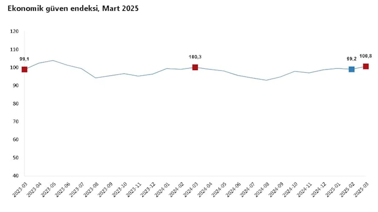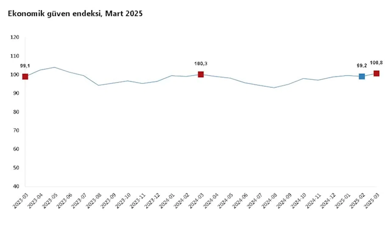 ANKARA, (DHA)- TÜRKİYE İstatistik Kurumu (TÜİK), mart ayında ekonomik güven endeksinin bir önceki aya göre yüzde 1,6 oranında artarak 100,8 olduğunu açıkladı.