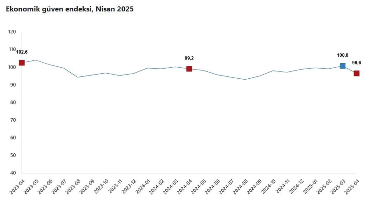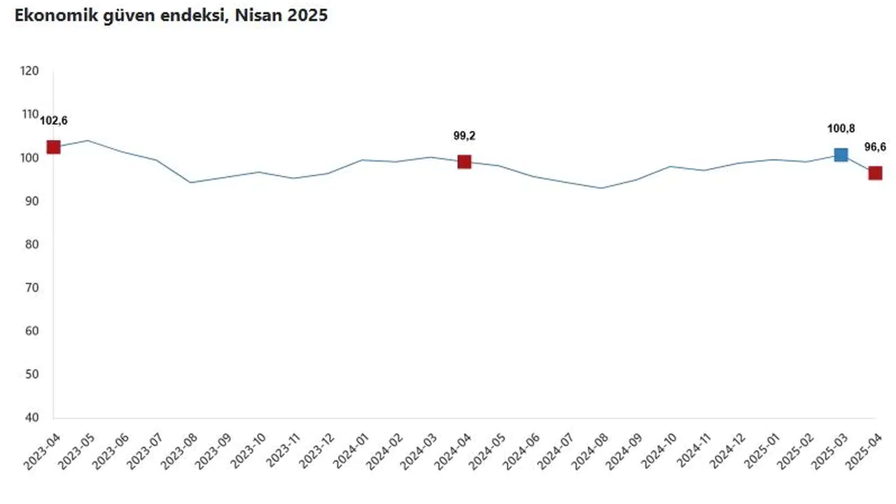 ANKARA, (DHA)- TÜRKİYE İstatistik Kurumu (TÜİK), nisan ayında ekonomik güven endeksinin, bir önceki aya göre yüzde 4,2 oranında azalıp 96,6 değerini aldığını açıkladı.