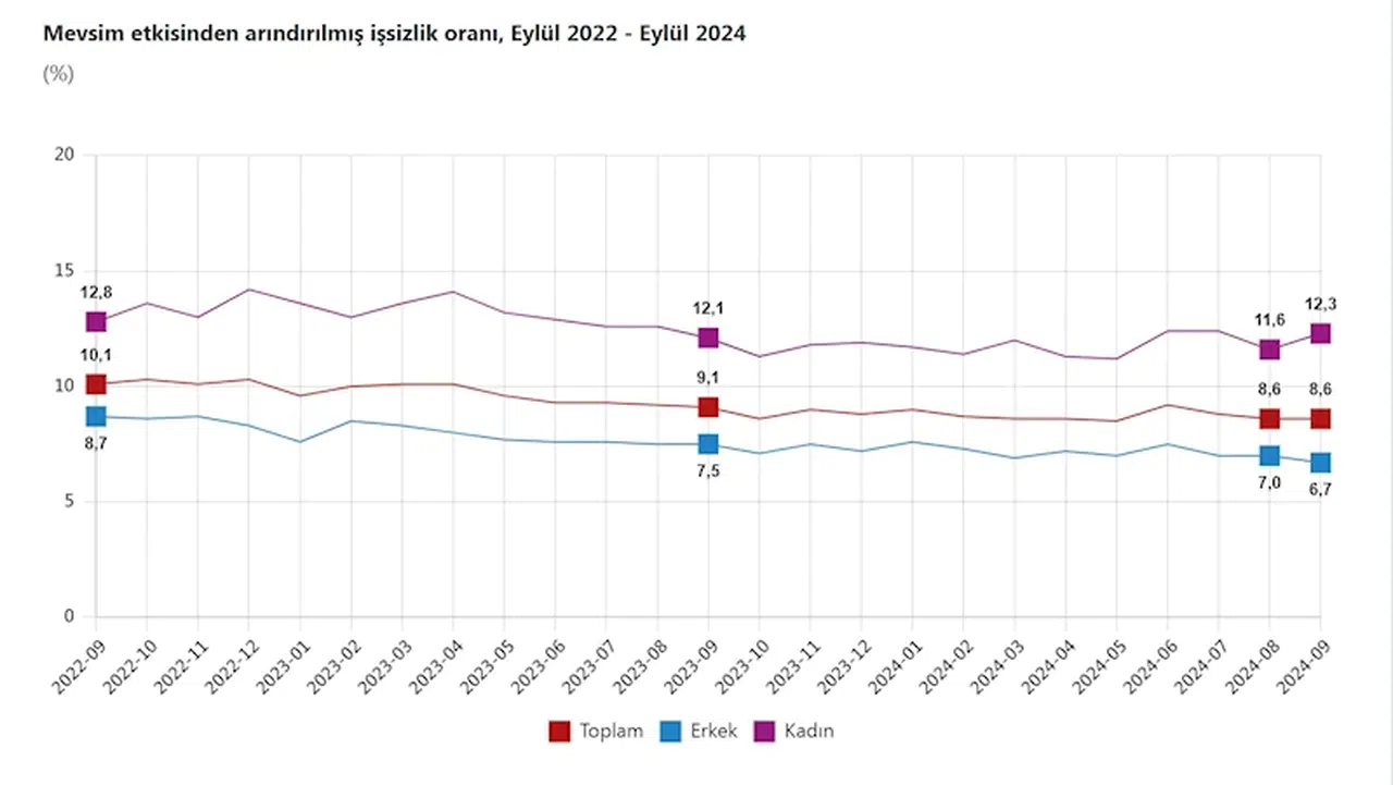 ANKARA, (DHA)- TÜRKİYE İstatistik Kurumu (TÜİK), eylül ayında işsizlik oranının önceki aya göre değişim göstermeyerek yüzde 8,6 seviyesinde gerçekleştiğini açıkladı.