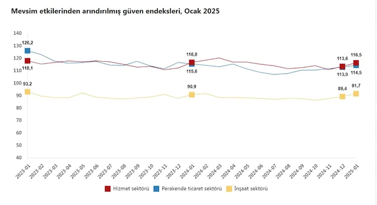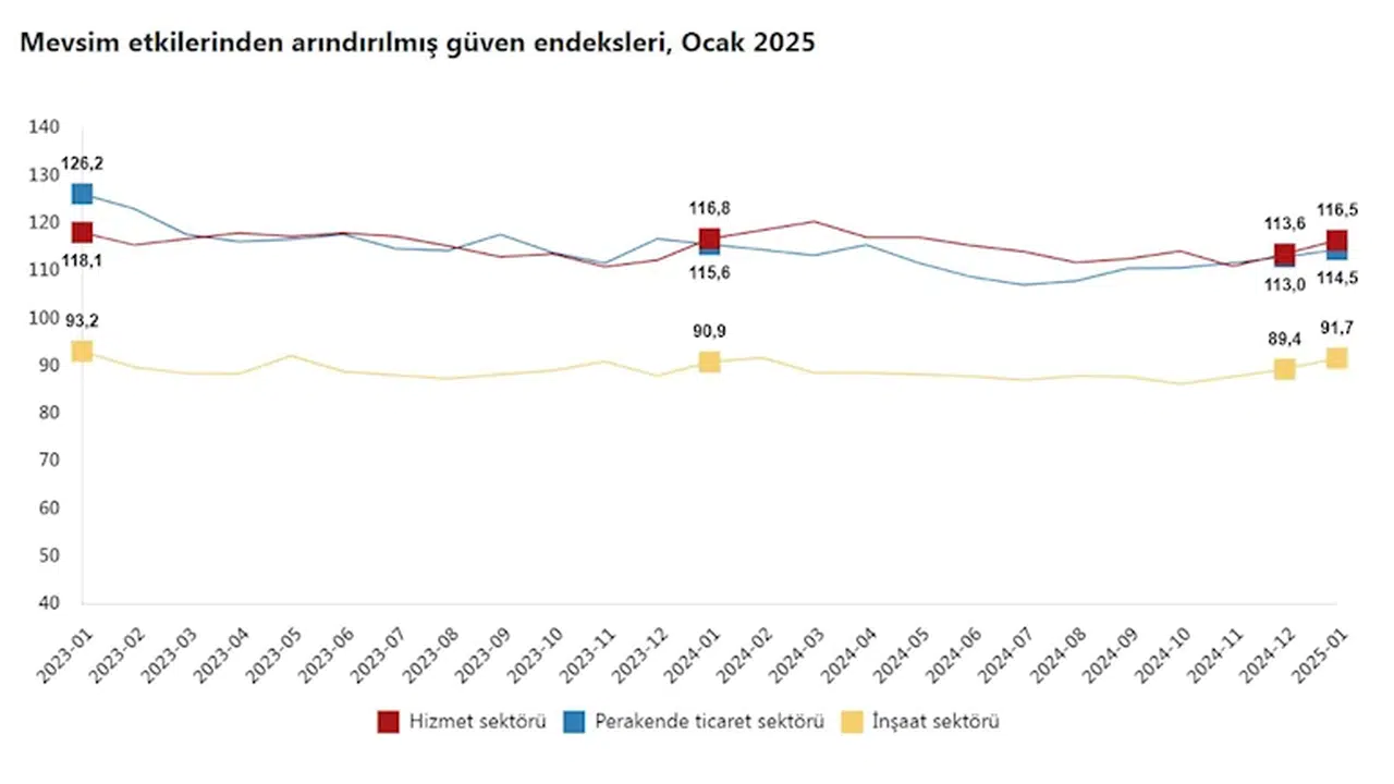 TÜİK, Ocak 2025 dönemine ilişkin hizmet, perakende ticaret ve inşaat güven endekslerini açıkladı. Buna göre; güven endeksi bir önceki aya göre hizmet sektöründe yüzde 2,5 oranında artarak 116,5 değerini, perakende ticaret sektöründe yüzde 1,4 oranında artarak 114,5 değerini ve inşaat sektöründe yüzde 2,6 oranında artarak 91,7 değerini aldı. (DHA)