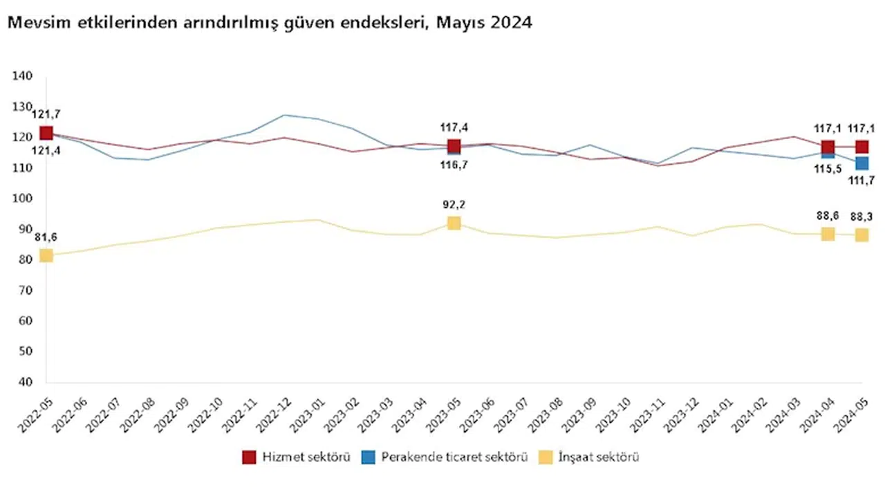 ANKARA, (DHA)- TÜRKİYE İstatistik Kurumu (TÜİK), mayıs ayında güven endeksinin hizmet sektöründe aynı kaldığını, perakende ticaret ve inşaat sektörlerinde yüzde 3,3 ile yüzde 0,3 oranlarında azaldığını açıkladı.