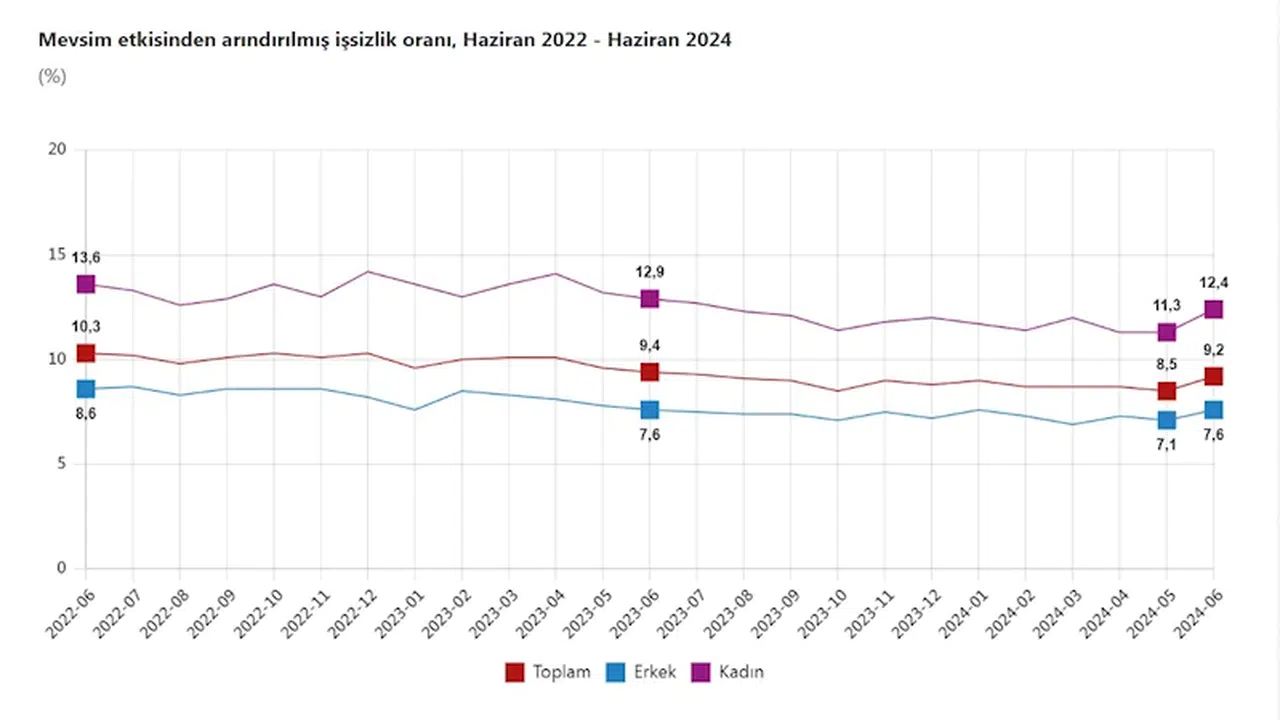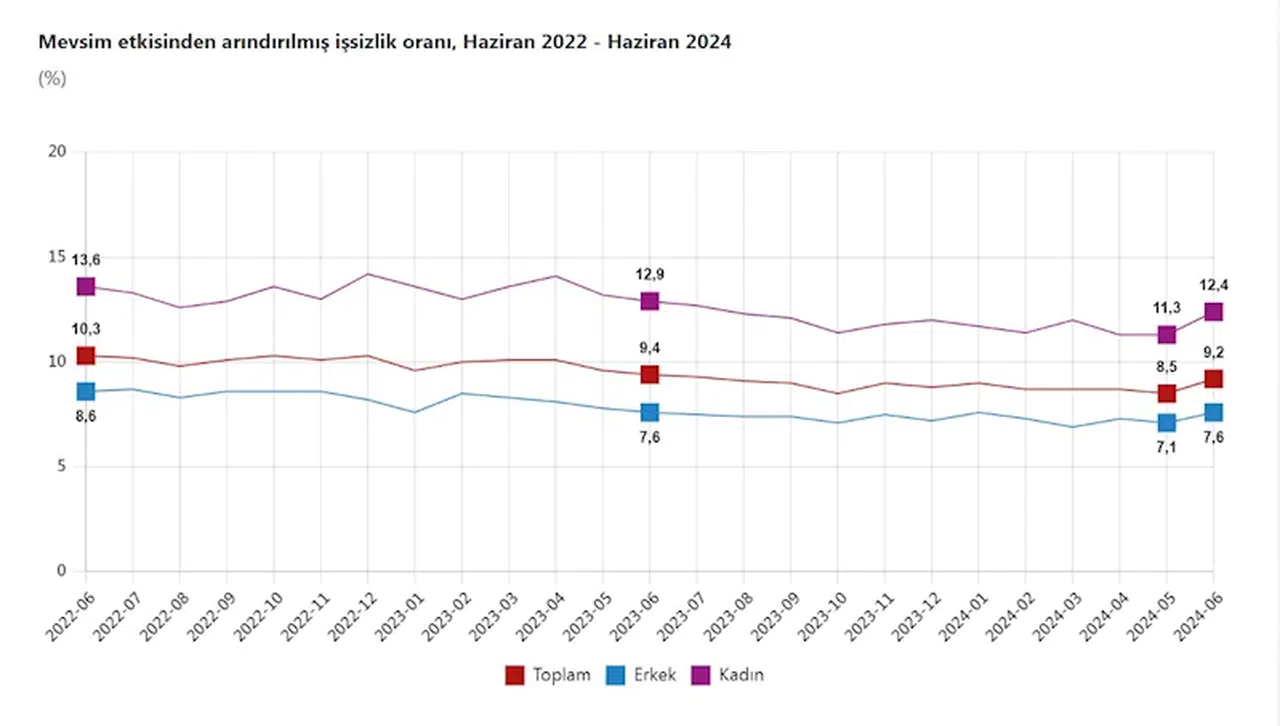 TÜİK, Haziran 2024 dönemine ilişkin iş gücü istatistiklerini açıkladı. Buna göre; 15 ve daha yukarı yaştaki kişilerde işsiz sayısı, bir önceki aya göre 234 bin kişi artarak 3 milyon 305 bin kişi oldu. İşsizlik oranı 0,7 puan artarak yüzde 9,2 seviyesinde gerçekleşti. İşsizlik oranı erkeklerde yüzde 7,6 iken kadınlarda yüzde 12,4 olarak tahmin edildi. İstihdam edilenlerin sayısı bir önceki aya göre, 341 bin kişi azalarak 32 milyon 522 bin kişi, istihdam oranı ise 0,6 puan azalarak yüzde 49,3 oldu. Bu oran erkeklerde yüzde 66,9 iken kadınlarda yüzde 32,1 olarak gerçekleşti. İş gücü bir önceki aya göre 107 bin kişi azalarak 35 milyon 827 bin kişi, iş gücüne katılma oranı 0,2 puan azalarak yüzde 54,4 olarak gerçekleşti. İş gücüne katılma oranı erkeklerde yüzde 72,4 iken kadınlarda yüzde 36,7 oldu.