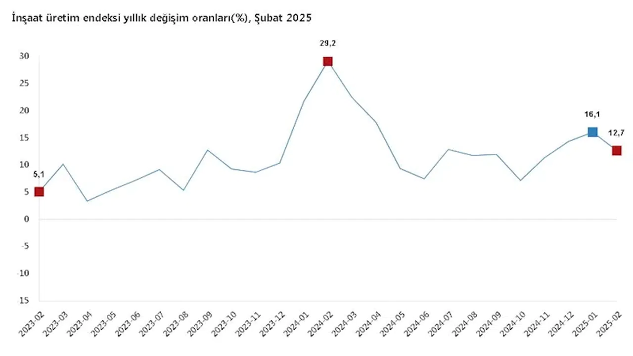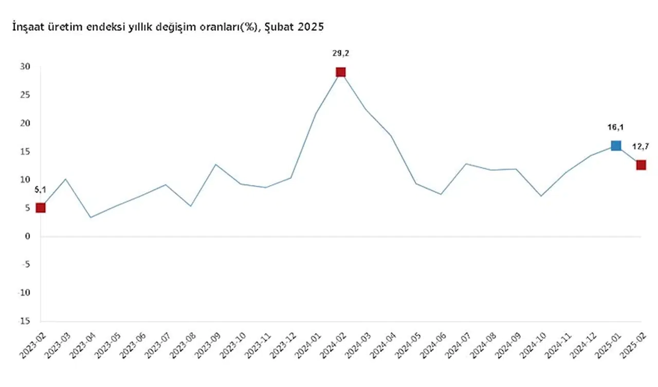 ANKARA, (DHA)-TÜRKİYE İstatistik Kurumu (TÜİK), şubat ayında inşaat üretiminin yıllık yüzde 12,7 arttığını; aylık yüzde 0,3 azaldığını açıkladı.