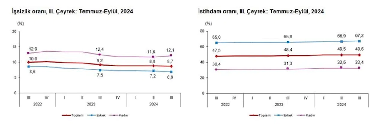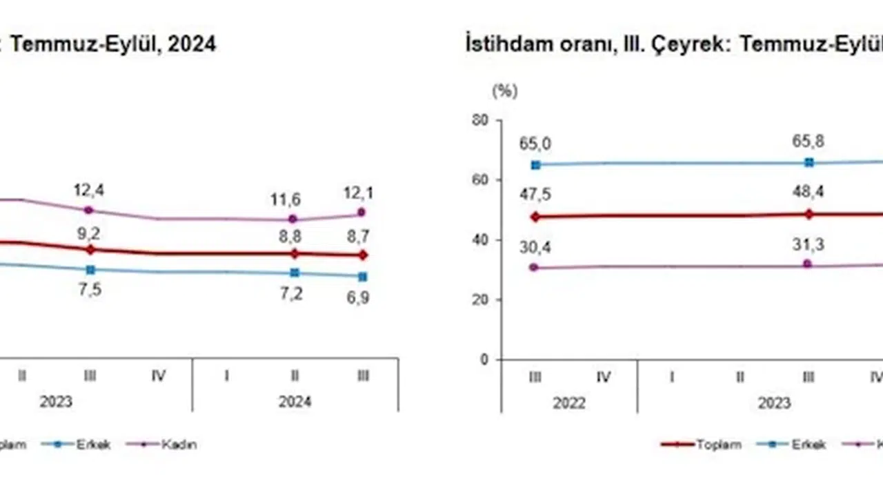 TÜİK, yılın 3'üncü çeyreğine ilişkin iş gücü istatistiklerini açıkladı. Buna göre; 15 ve daha yukarı yaştaki kişilerde işsiz sayısı, bir önceki çeyreğe göre 20 bin kişi azalarak 3 milyon 106 bin kişi oldu. İşsizlik oranı 0,1 puanlık azalış ile yüzde 8,7 seviyesinde gerçekleşti. İşsizlik oranı erkeklerde yüzde 6,9, kadınlarda yüzde 12,1 kaydedildi. İstihdam edilenlerin sayısı, bir önceki çeyreğe göre 136 bin kişi artarak 32 milyon 734 bin kişi, istihdam oranı 0,1 puanlık artış ile yüzde 49,6 oldu. Bu oran erkeklerde yüzde 67,2 iken, kadınlarda yüzde 32,4 olarak gerçekleşti.