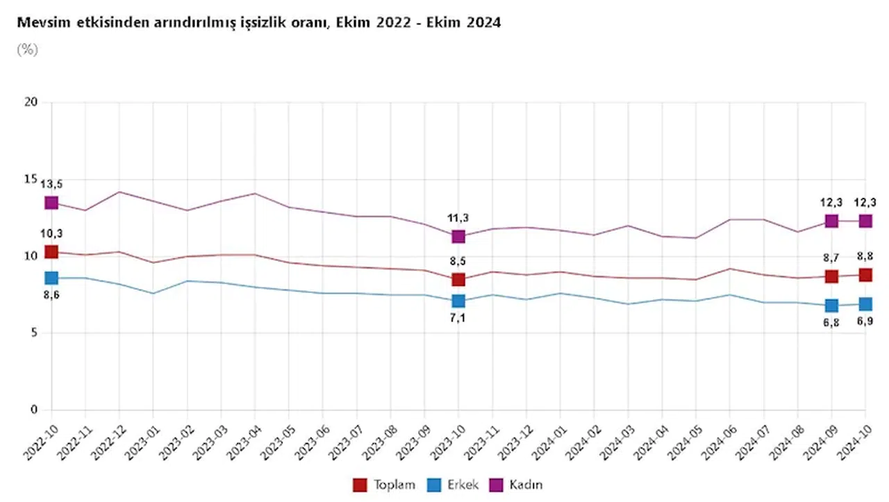 TÜİK, Ekim 2024 dönemine ilişkin iş gücü istatistiklerini açıkladı. Buna göre; 15 ve daha yukarı yaştaki kişilerde işsiz sayısı bir önceki aya göre 61 bin kişi artarak 3 milyon 175 bin kişi oldu. İşsizlik oranı 0,1 puan artarak yüzde 8,8 seviyesinde gerçekleşti. İşsizlik oranı erkeklerde yüzde 6,9 iken kadınlarda yüzde 12,3 olarak gerçekleşti. İstihdam edilenlerin sayısı, bir önceki aya göre 156 bin kişi artarak 32 milyon 970 bin kişi, istihdam oranı 0,2 puan artarak yüzde 49,9 oldu. Bu oran erkeklerde yüzde 67,4, kadınlarda yüzde 32,8 kaydedildi. İş gücü, bir önceki aya göre 219 bin kişi artarak 36 milyon 146 bin kişi, iş gücüne katılma oranı 0,3 puan artarak yüzde 54,7 olarak gerçekleşti. İş gücüne katılma oranı erkeklerde yüzde 72,4 iken kadınlarda yüzde 37,4 oldu.
