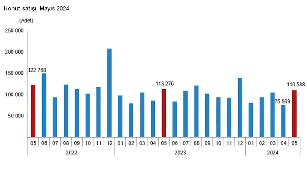 TÜİK, Mayıs 2024 dönemine ilişkin konut satış istatistiklerini açıkladı. Buna göre; Türkiye genelinde konut satışları mayıs ayında bir önceki yılın aynı ayına göre yüzde 2,4 azalarak 110 bin 588 oldu. Konut satış sayısının en fazla olduğu iller, 18 bin 814 ile İstanbul, 9 bin 861 ile Ankara ve 6 bin 306 ile Antalya olurken; en az olduğu iller 37 ile Bayburt, 46 ile Ardahan ve 60 ile Hakkari oldu. Konut satışları ocak-mayıs döneminde bir önceki yılın aynı dönemine göre yüzde 3,4 azalışla 465 bin 761 olarak gerçekleşti.