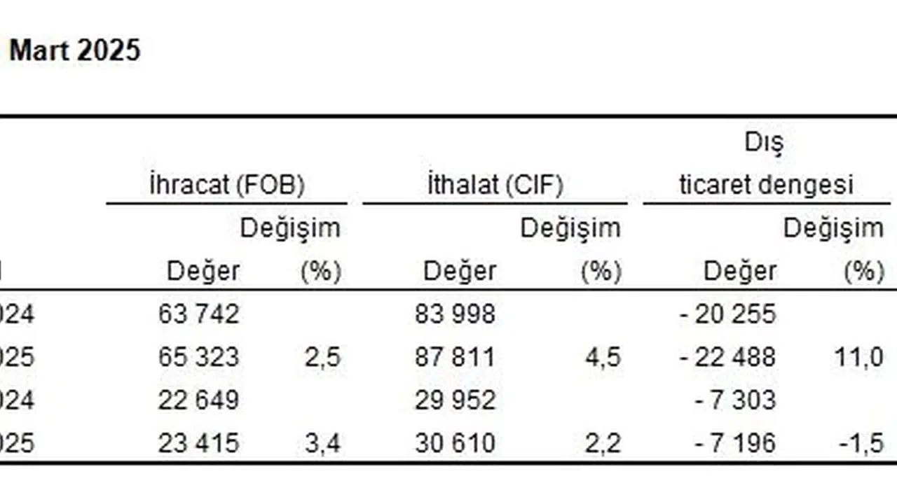 TÜİK, Mart 2025 dönemine ilişkin dış ticaret istatistiklerini açıkladı. Buna göre; 2025 yılı Mart ayında ihracat bir önceki yılın aynı ayına göre yüzde 3,4 artarak 23 milyar 415 milyon dolar, ithalat yüzde 2,2 artarak 30 milyar 610 milyon dolar olarak gerçekleşti. 2025 yılı Ocak-Mart döneminde ihracat bir önceki yılın aynı dönemine göre yüzde 2,5 artarak 65 milyar 323 milyon dolar, ithalat yüzde 4,5 artarak 87 milyar 811 milyon dolar olarak gerçekleşti.