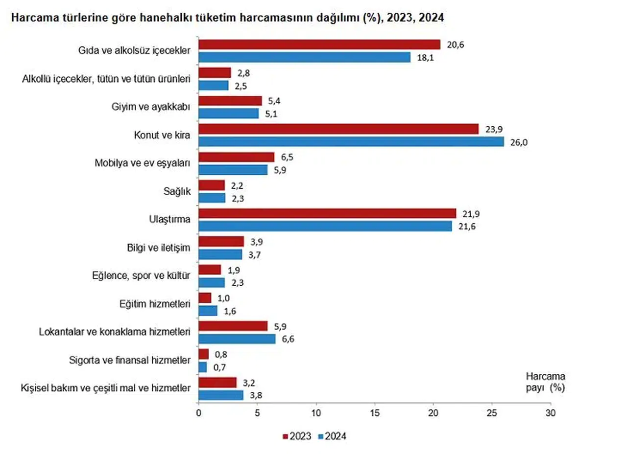 TÜİK, 2024 yılına ilişkin hanehalkı tüketim harcaması istatistiklerini açıkladı. Buna göre; Türkiye genelinde hanehalklarının tüketim amaçlı yaptığı harcamalar içinde en yüksek payı yüzde 26 ile konut ve kira harcamaları alırken, ikinci sırayı yüzde 21,6 ile ulaştırma harcamaları, üçüncü sırayı ise yüzde 18,1 ile gıda ve alkolsüz içecekler harcamaları aldı. Toplam tüketim harcamalarında en düşük payı alan harcama türleri ise yüzde 0,7 ile sigorta ve finansal hizmetler, yüzde 1,6 ile eğitim hizmetleri ve yüzde 2,3 ile eğlence, spor ve kültür ile sağlık harcamaları oldu.