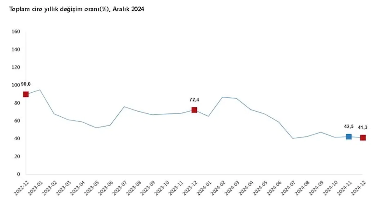 TÜİK, Aralık 2024 dönemine ilişkin ciro ve ticaret satış hacim endekslerini açıkladı. Buna göre; sanayi, inşaat, ticaret ve hizmet sektörleri toplamında ciro endeksi, bir önceki yılın aynı ayına göre yüzde 41,3 arttı. Toplam cironun alt detaylarına bakıldığında, sanayi sektörü ciro endeksi yüzde 32,8, inşaat ciro endeksi yüzde 49,3, ticaret ciro endeksi yüzde 41,9, hizmet ciro endeksi ise yüzde 49,7 arttı. Sanayi, inşaat, ticaret ve hizmet sektörleri toplamında ciro endeksi, bir önceki aya göre yüzde 5,1 arttı. Alt detaylarına bakıldığında ise aylık sanayi sektörü ciro endeksi yüzde 5,9, inşaat ciro endeksi yüzde 1,4, ticaret ciro endeksi yüzde 5,6, hizmet ciro endeksi yüzde 3,7 arttı.