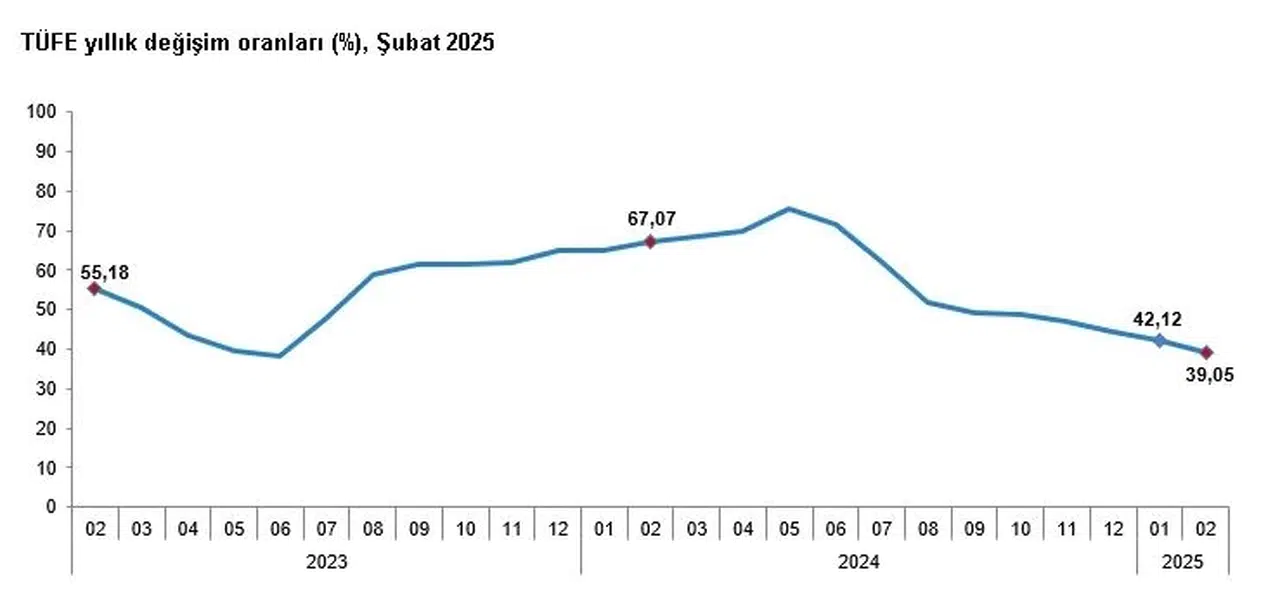 TÜİK, Şubat 2025 dönemine ilişkin enflasyon verilerini açıkladı. Buna göre; tüketici fiyatları bir önceki aya göre yüzde 2,27, bir önceki yılın aralık ayına göre yüzde 7,42, bir önceki yılın aynı ayına göre yüzde 39,05 ve 12 aylık ortalamalara göre yüzde 53,83 arttı.