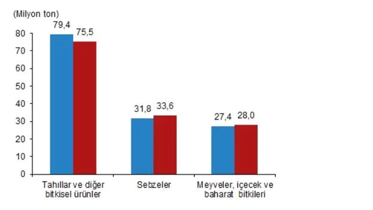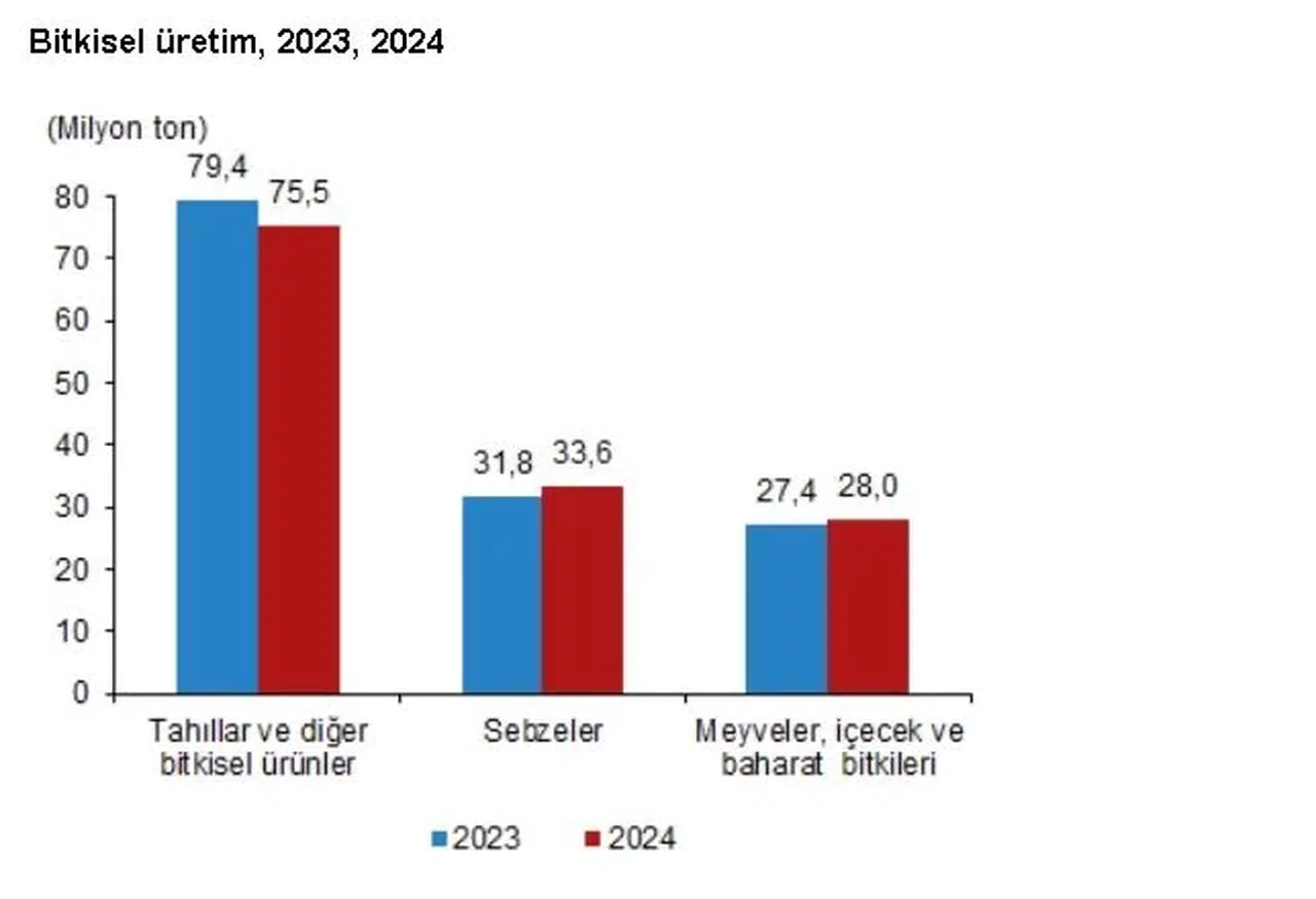 TÜİK, 2024 yılına ilişkin bitkisel üretim istatistiklerini açıkladı. Üretim miktarları, bir önceki yıla göre tarla ürünleri olan tahıllar ve diğer bitkisel ürünlerde (yem bitkileri hariç) yüzde 5 azaldı; sebzelerde yüzde 5,6, meyveler, içecek ve baharat bitkilerinde yüzde 2,1 oranında arttı. Yaklaşık üretim miktarları tahıllar ve diğer bitkisel ürünlerde 75,5 milyon ton, sebzelerde 33,6 milyon ton, meyveler, içecek ve baharat bitkilerinde 28 milyon ton olarak gerçekleşti. Tahıl ürünleri üretim miktarları bir önceki yıla göre yüzde 7,5 oranında azalarak yaklaşık 39 milyon ton olarak gerçekleşti.