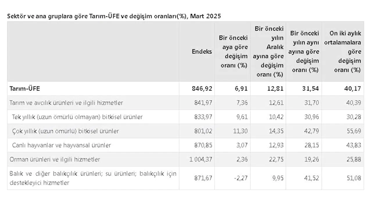ANKARA, (DHA)- TÜRKİYE İstatistik Kurumu (TÜİK), mart ayında tarım ürünleri üretici fiyatlarının yıllık yüzde 31,54; aylık yüzde 6,91 arttığını açıkladı.