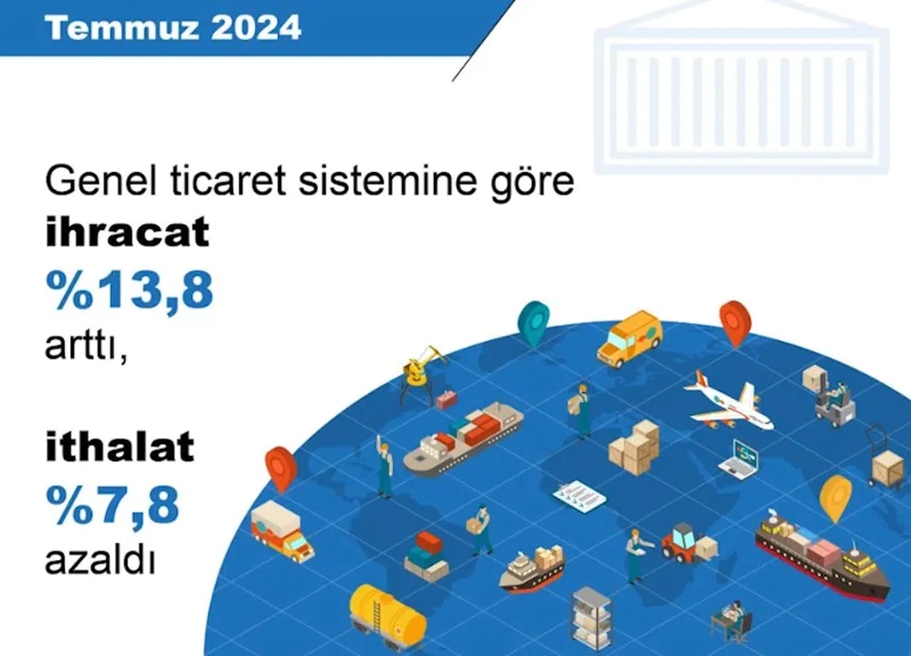 ANKARA, (DHA)-TÜRKİYE İstatistik Kurumu (TÜİK), temmuz ayında bir önceki yılın aynı ayına göre ihracatın yüzde 13,8 arttığını, ithalatın yüzde 7,8 azaldığını açıkladı.