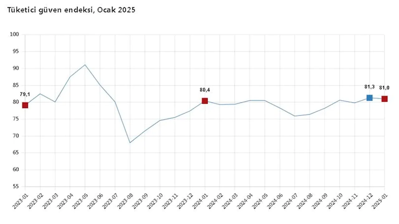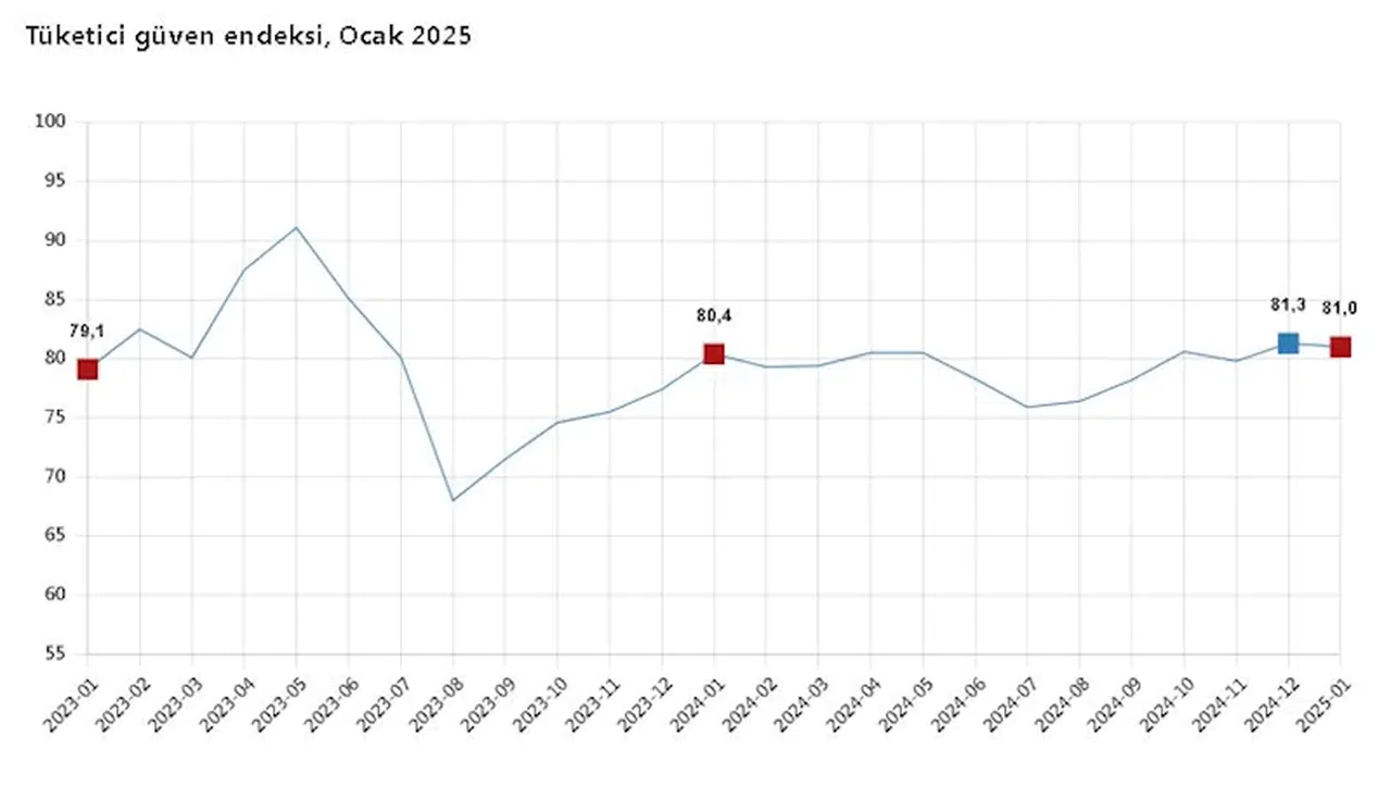 ANKARA, (DHA)-TÜRKİYE İstatistik Kurumu (TÜİK), tüketici güven endeksinin ocakta bir önceki aya göre yüzde 0,4 azalarak 81 olduğunu açıkladı.